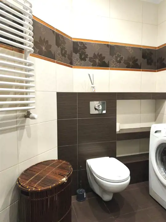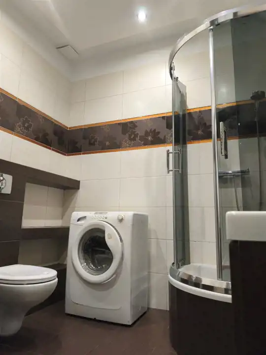 - Łazienka : prysznic, umywalka, WC, pralka, kosz na bieliznę.