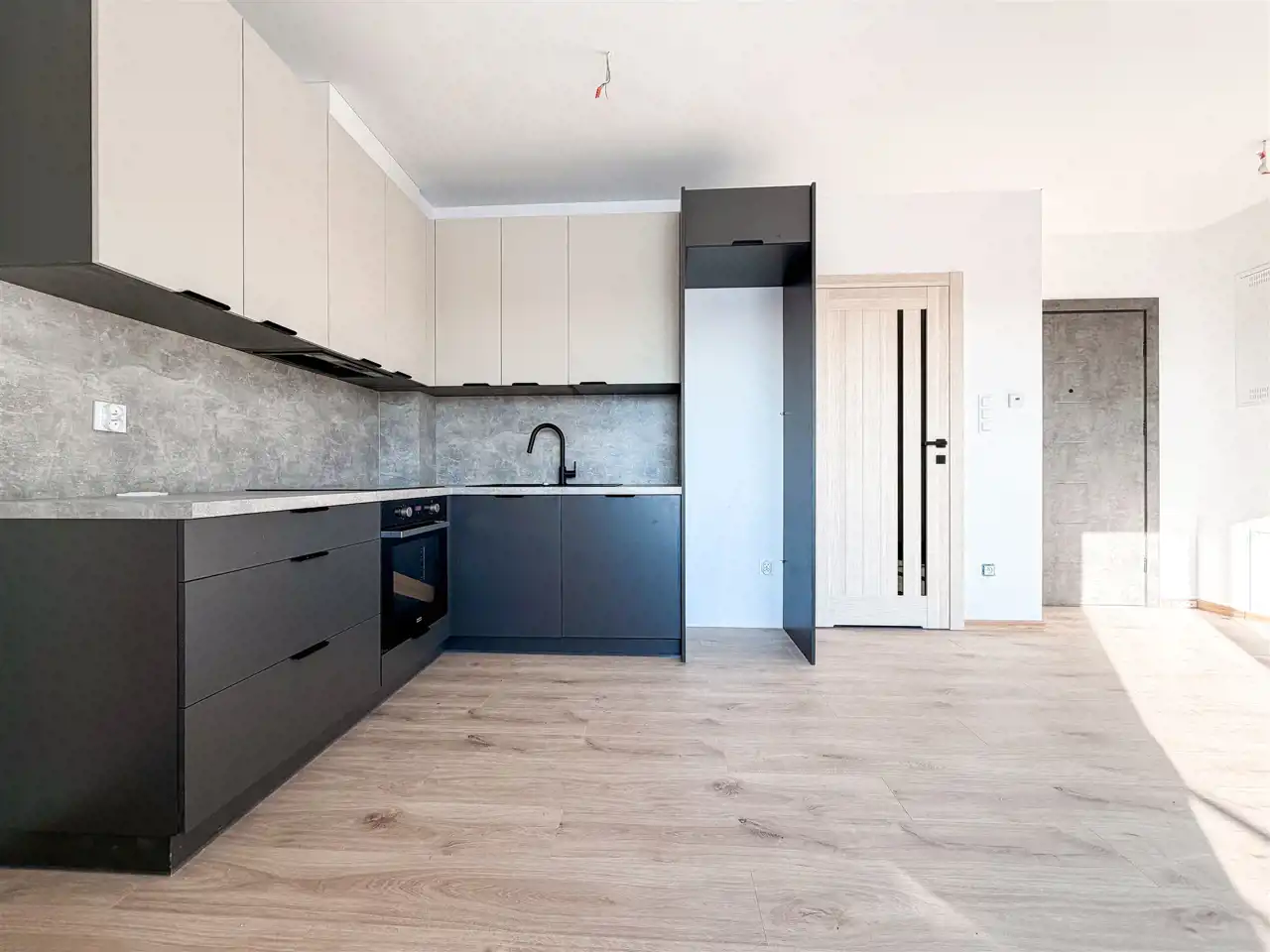 Kuchnie w kolorze szarym wykonano na wymiar z wysokiej jakości materiałów, wyposażono w sprzęt AGD (piekarnik, płyta indukcyjna, zmywarka). Połączenie salonu z jadalnią i aneksem kuchennym sprawia, że wnętrze jest funkcjonalne.