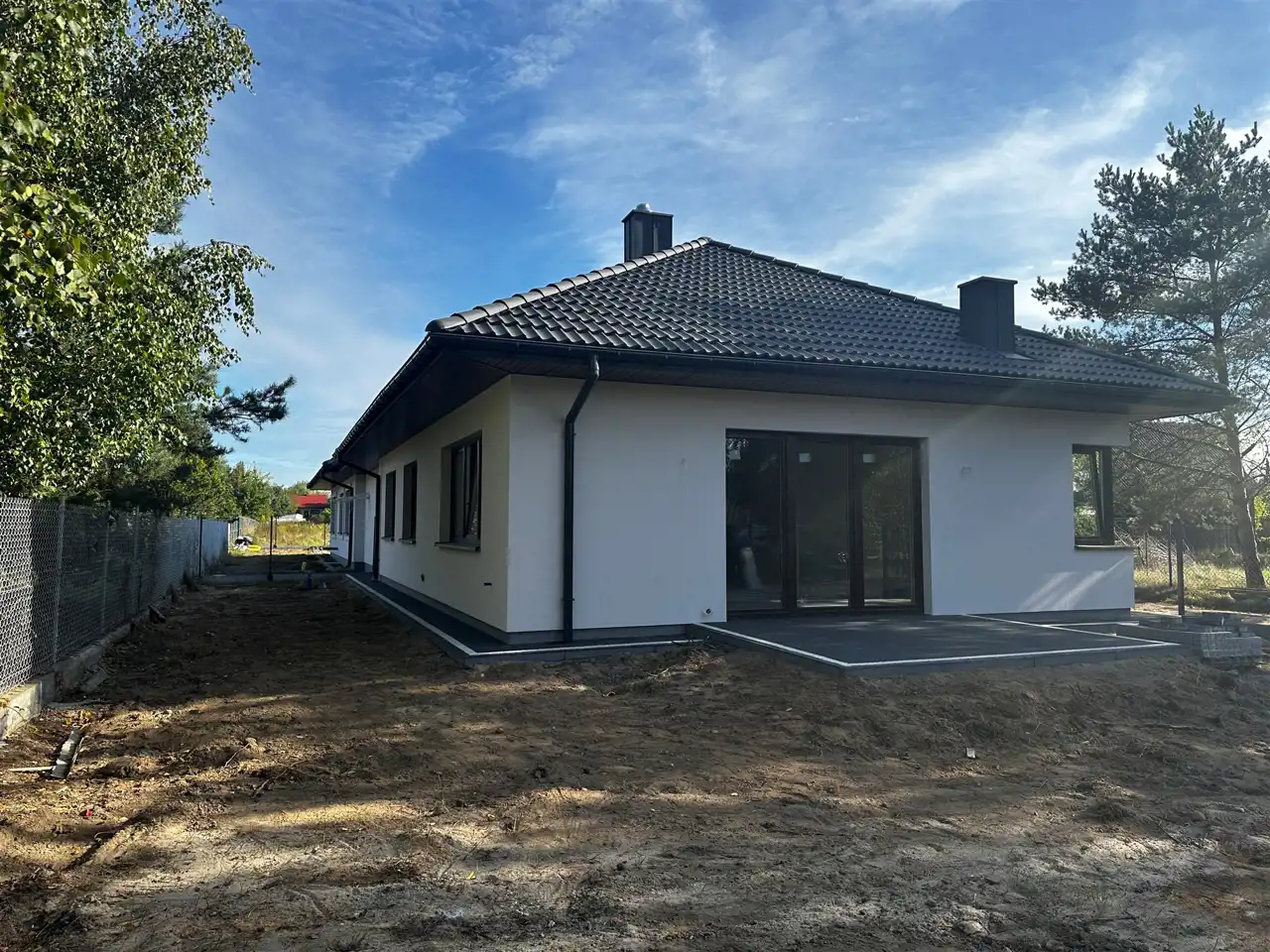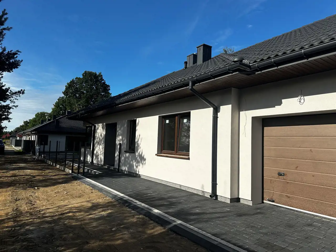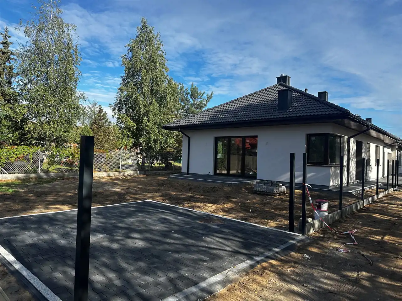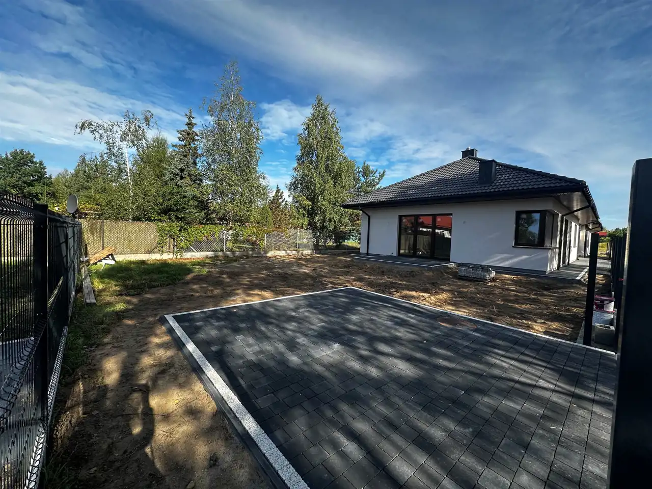 Działka ogrodzona, podjazd, opaska wokół budynku, chodnik oraz taras wyłożony kostką.