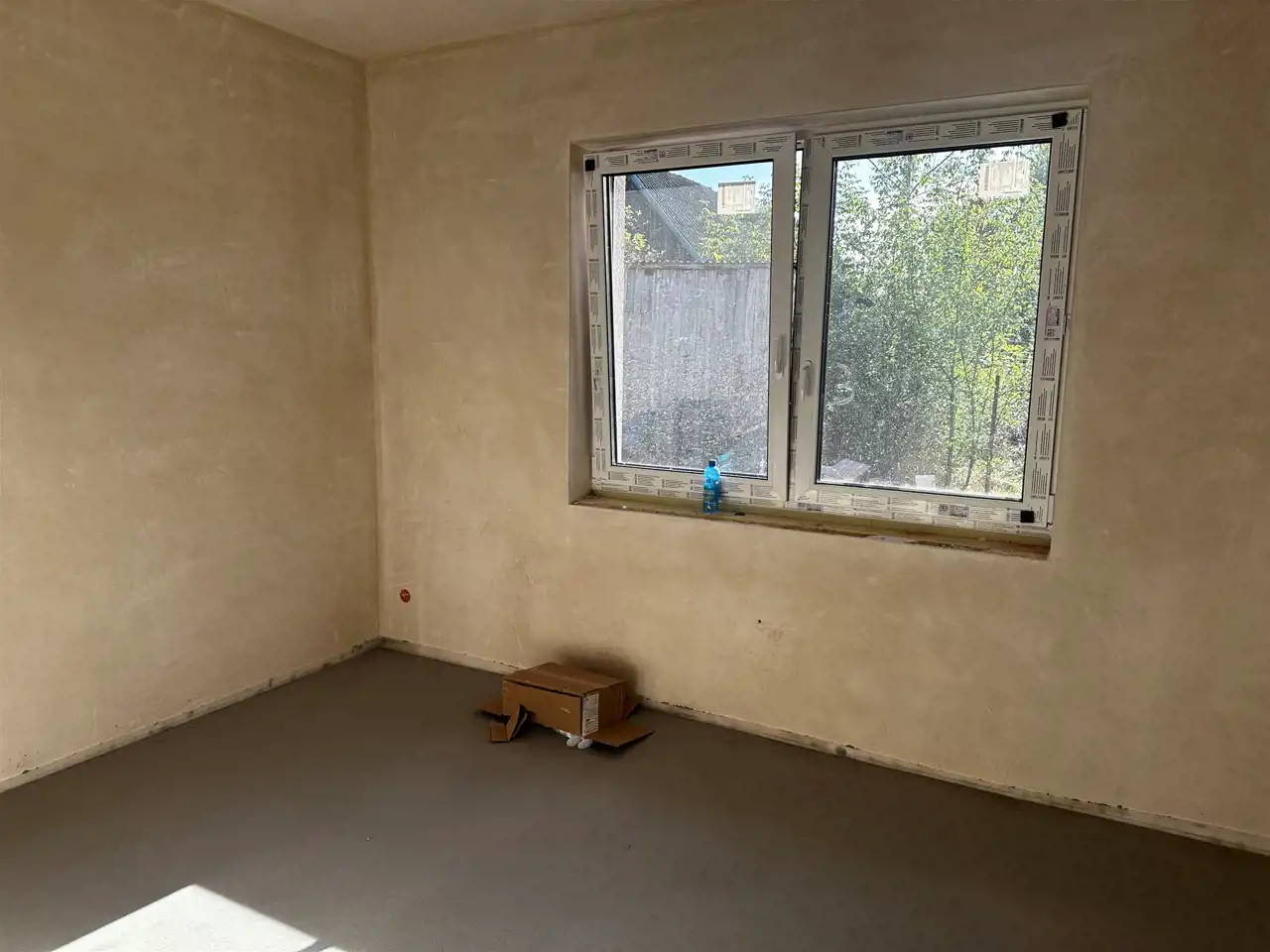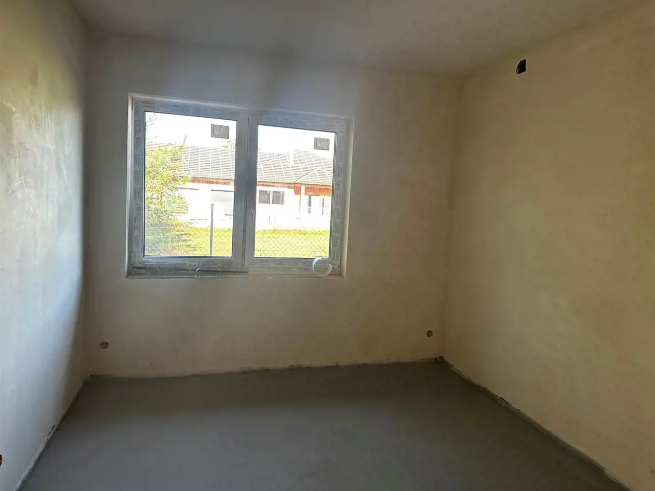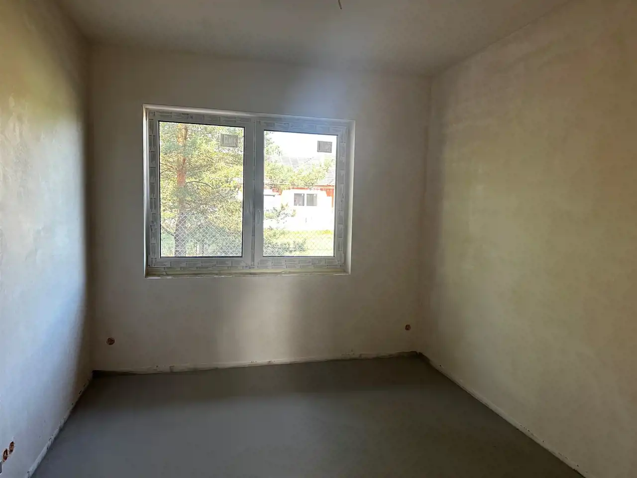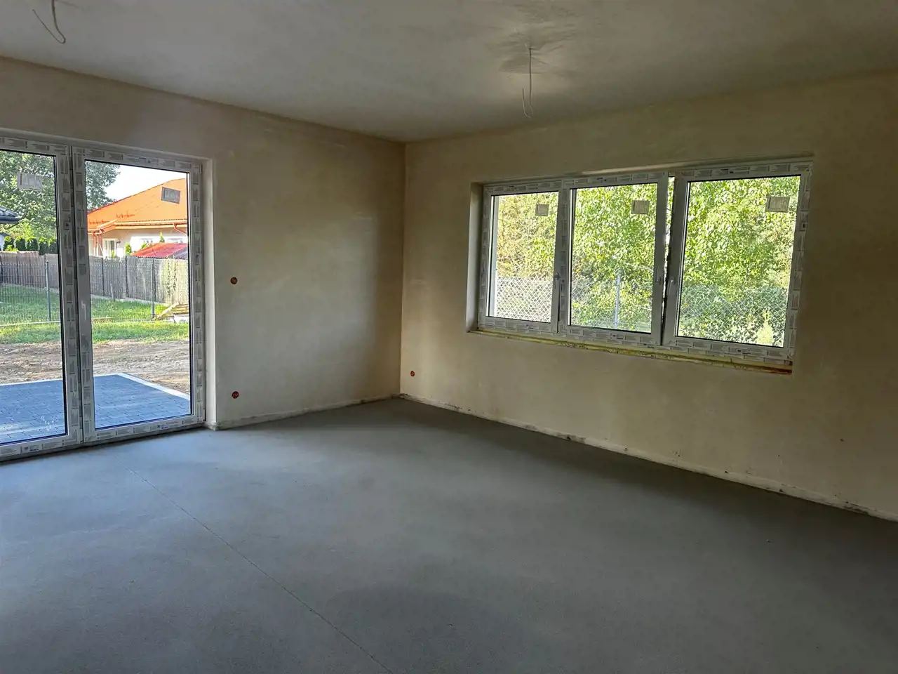 Działka ogrodzona, podjazd, opaska wokół budynku, chodnik oraz taras wyłożony kostką.