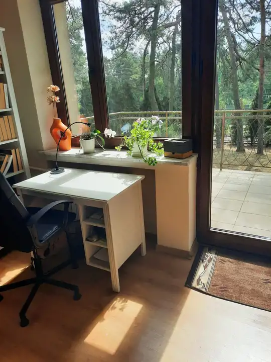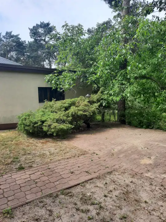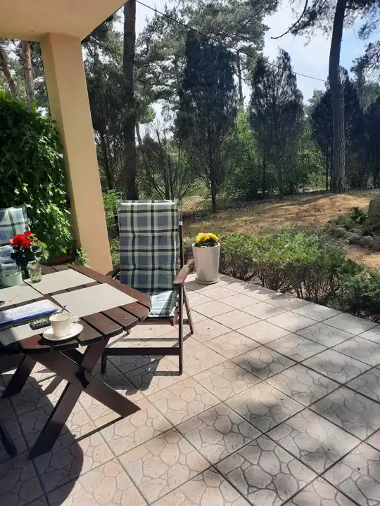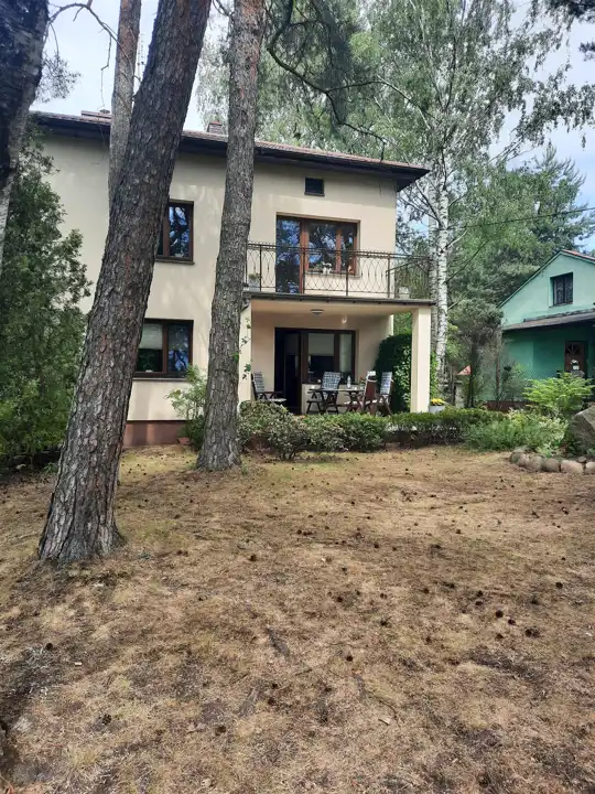 Parter : korytarz( z szafami typu Komandor); łazienka z wc i kabiną prysznicową ; kuchnia; salon; sypialnia ; duży taras ( z zejściem do częściowo zalesionej części działki)