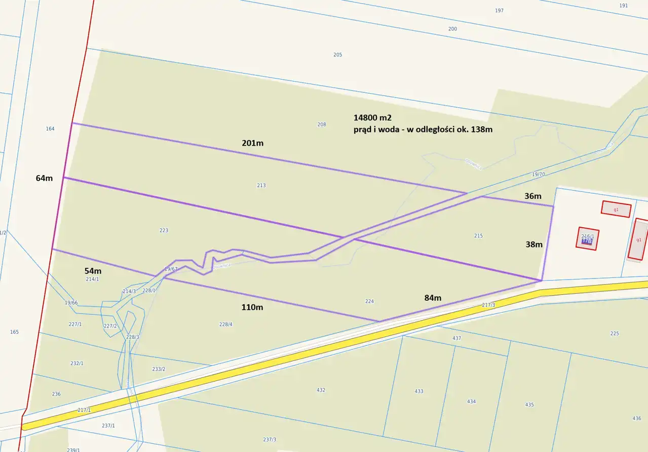- Media Woda: w ulicy; Kanalizacja: brak; Prąd: w ulicy; Gaz: brak