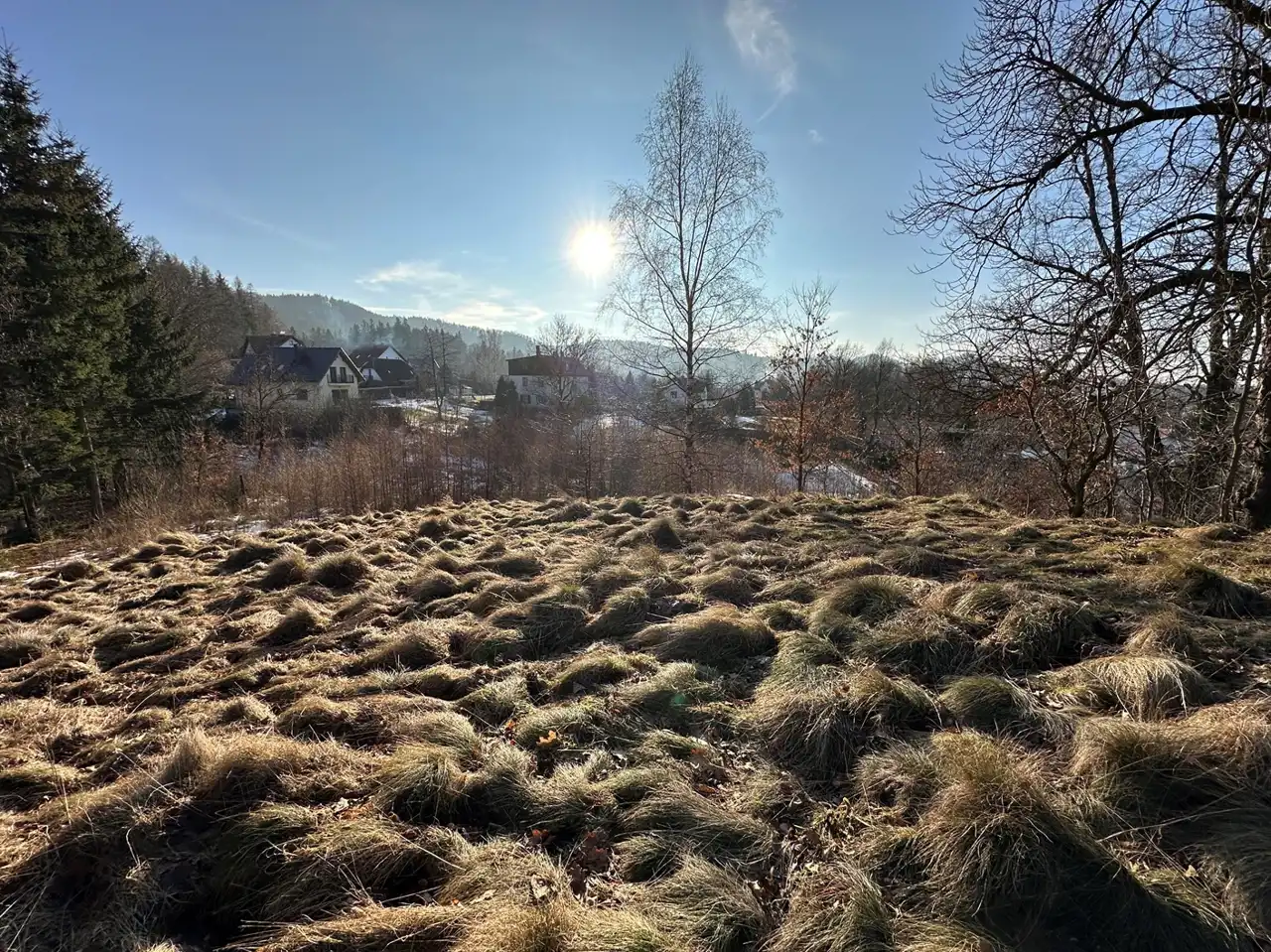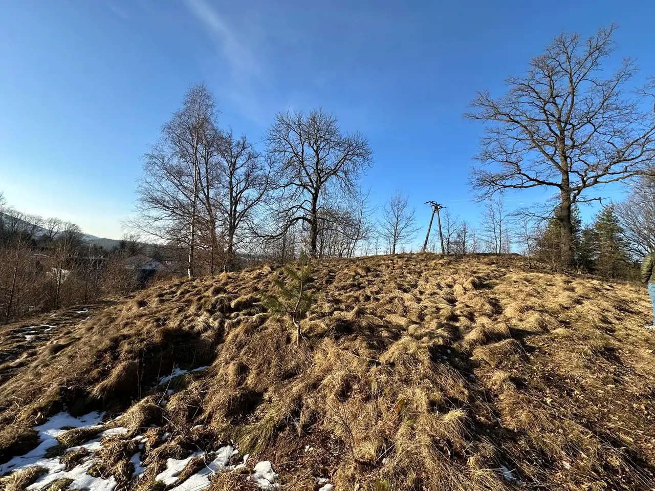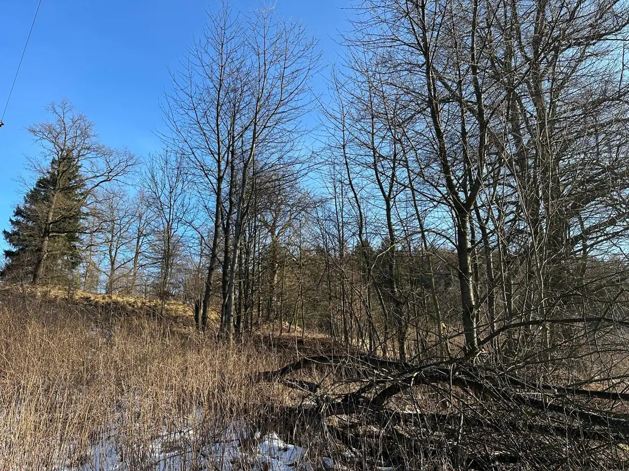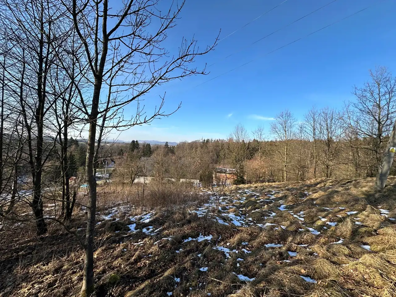 Zaraz przy działce znajduje się las a poniżej działki kilka domów (których nie widać gdy teren się zazieleni.