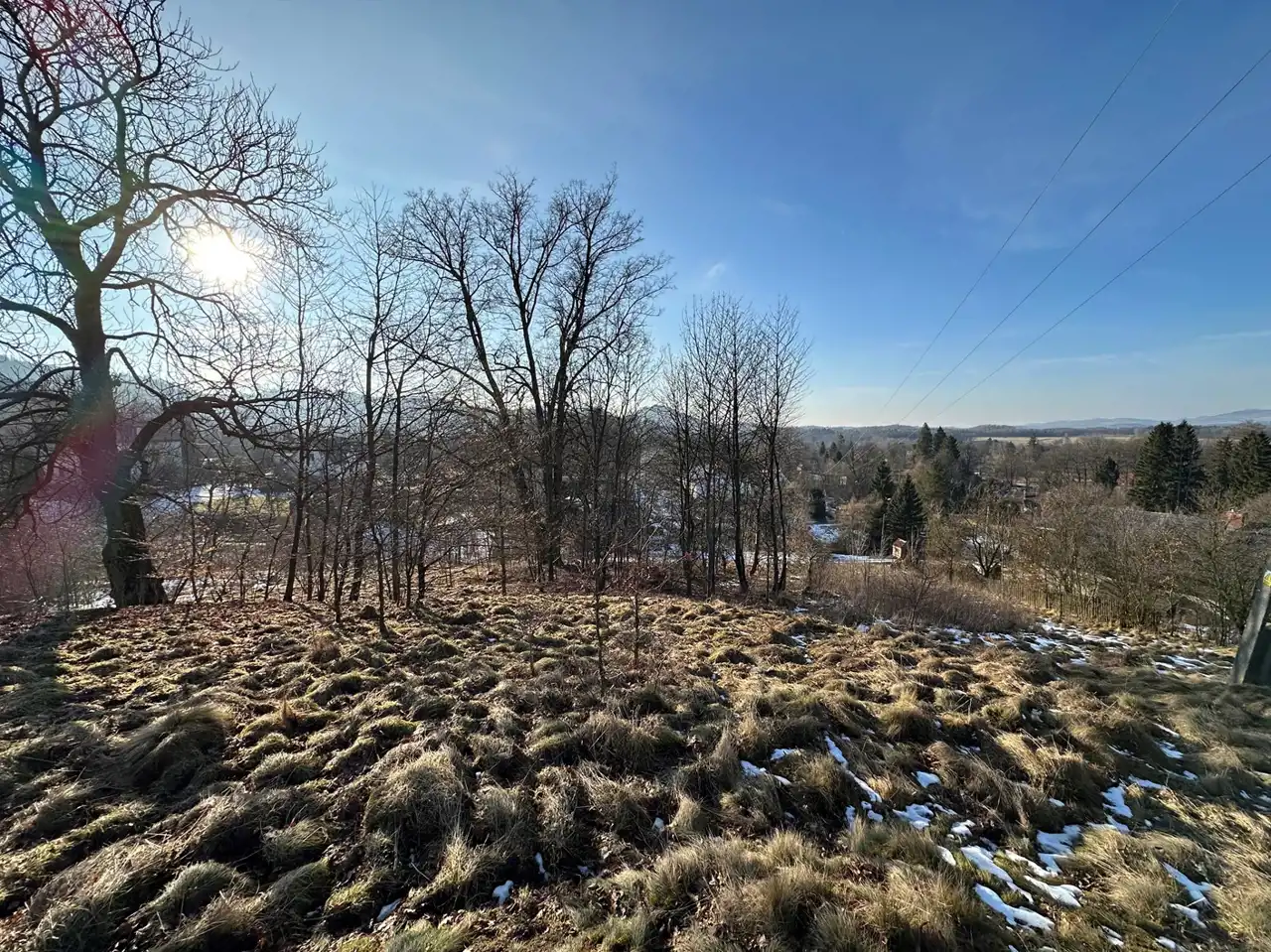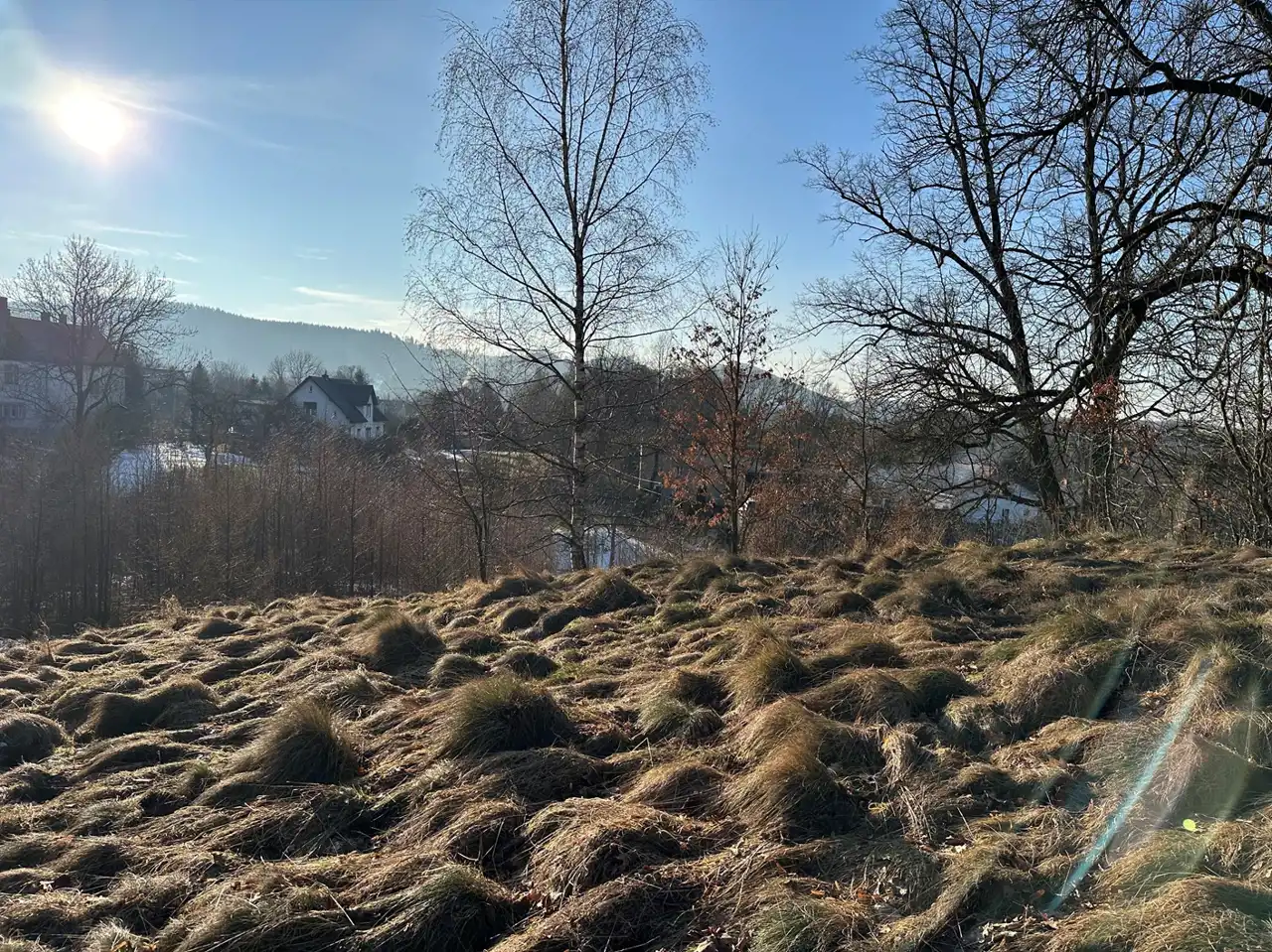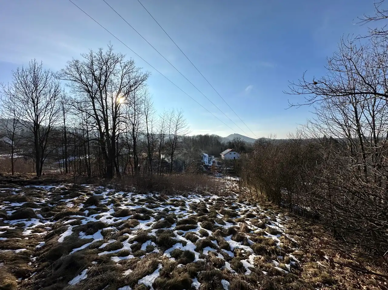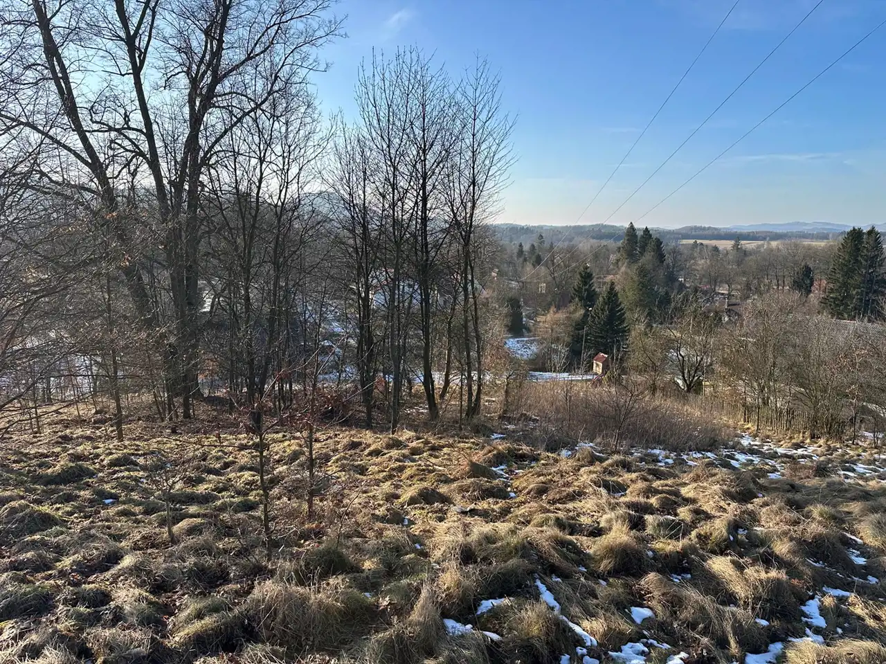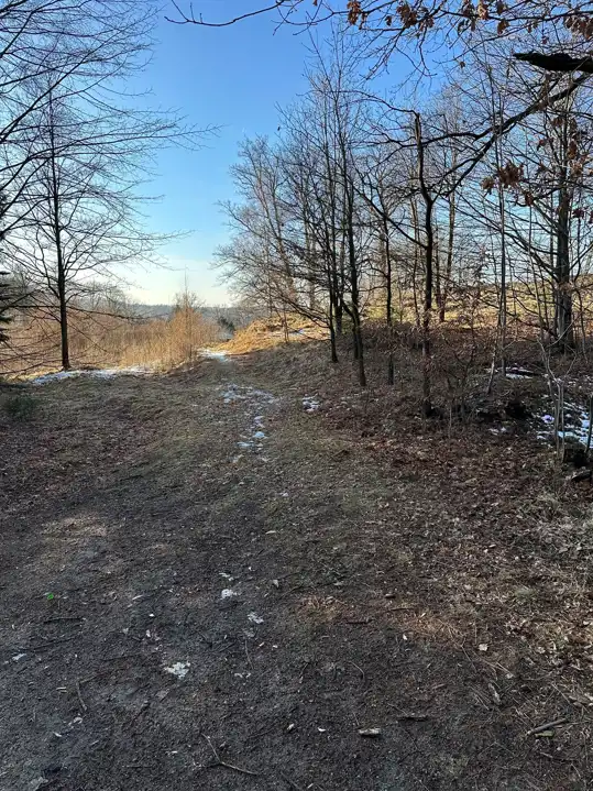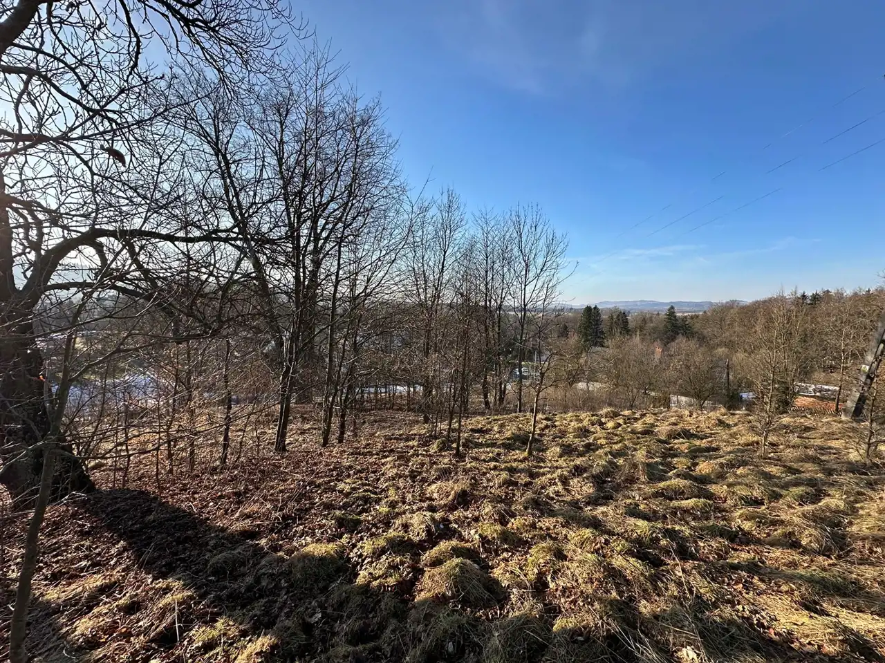 Zaraz przy działce znajduje się las a poniżej działki kilka domów (których nie widać gdy teren się zazieleni.