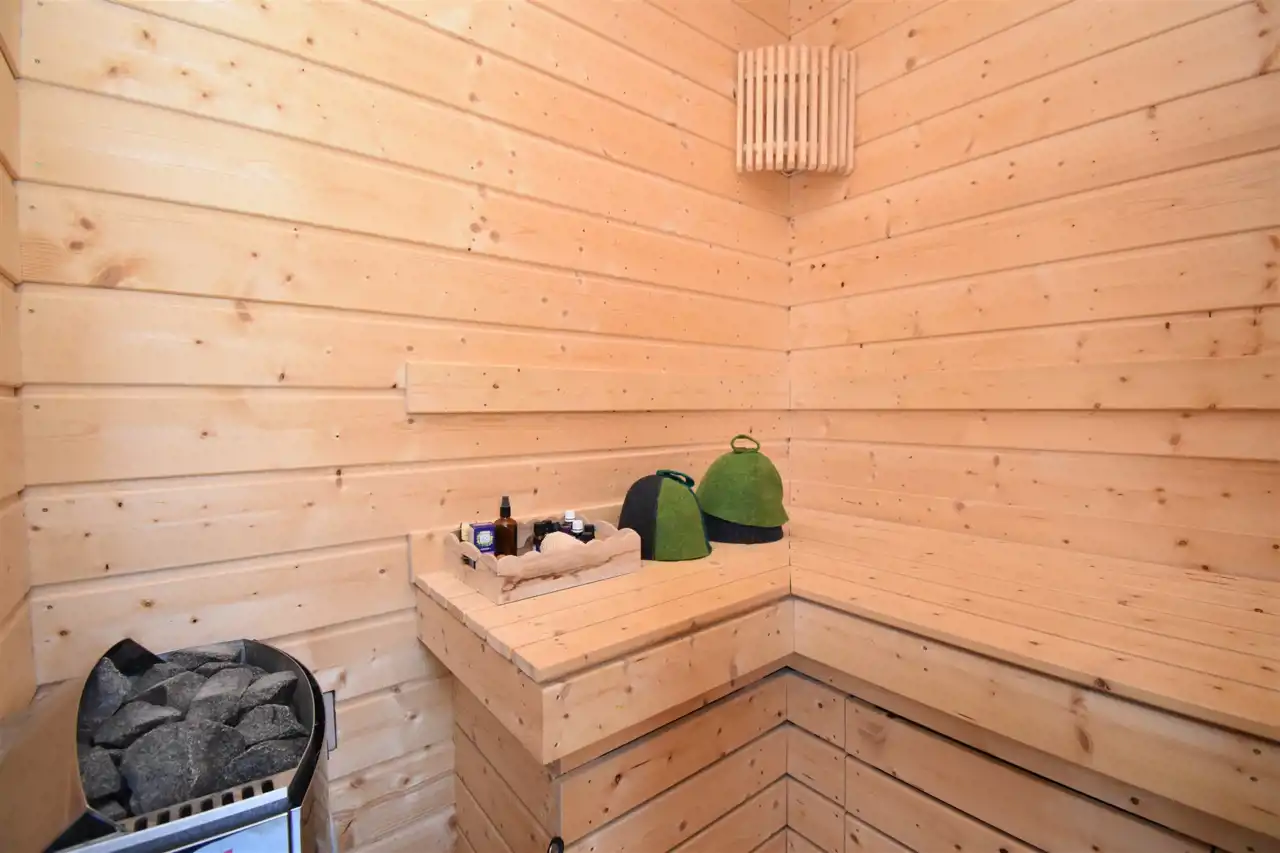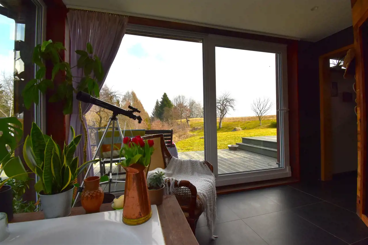 - unikalnej łazienki z wanną, wyposażonej w saunę, z której rozpościera się piękny widok na otaczający las;