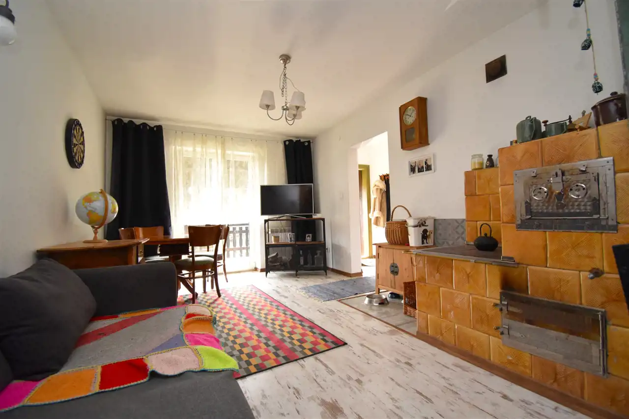 - salonu z aneksem kuchennym oraz kuchnią kaflowo-węglową -rozwiązaniem, który nie tylko wprowadza rustykalny klimat, ale również zapewnia funkcjonalność przy codziennym gotowaniu;