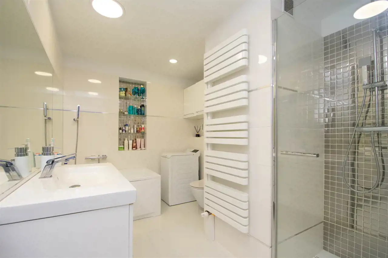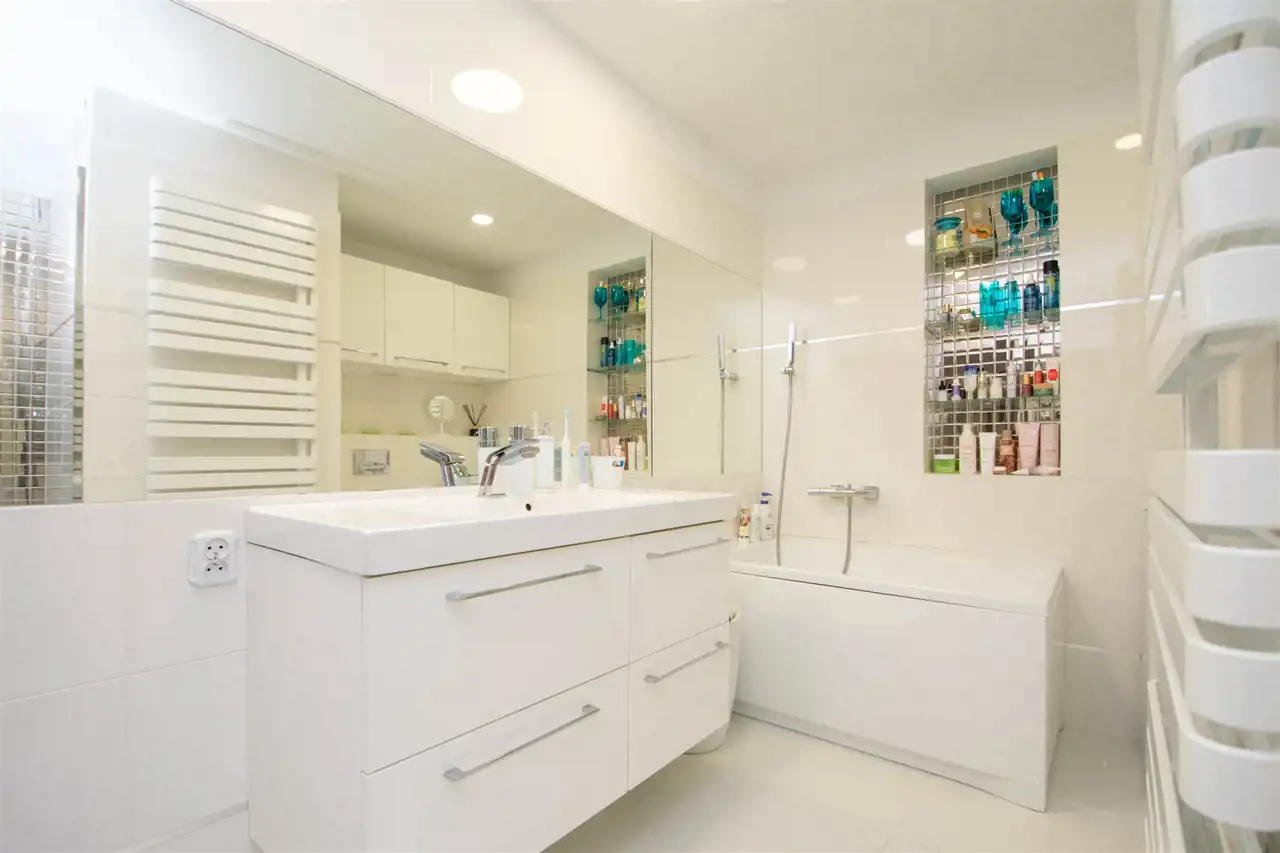 - łazienka o powierzchni 6,9m2 z dużą szafką pod umywalką oraz trzema szafkami wiszącymi