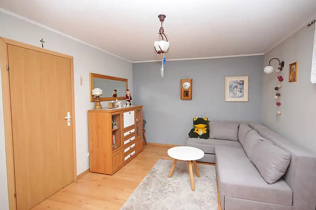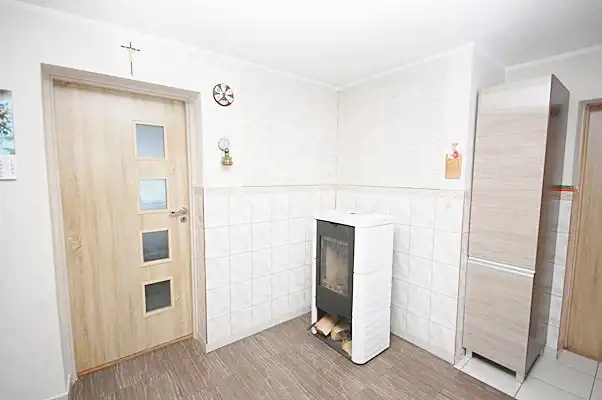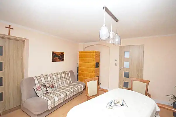 Przytulny, z piecem kaflowym, wykończony panelami i płytami karton-gips.