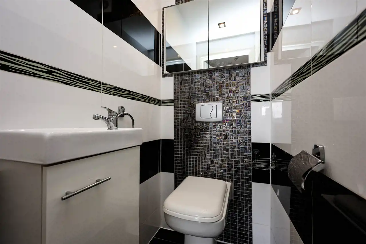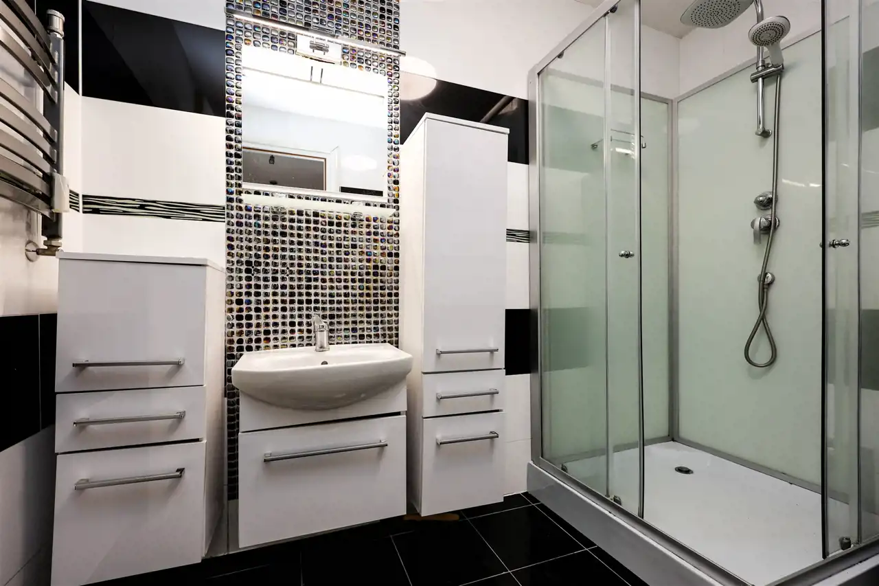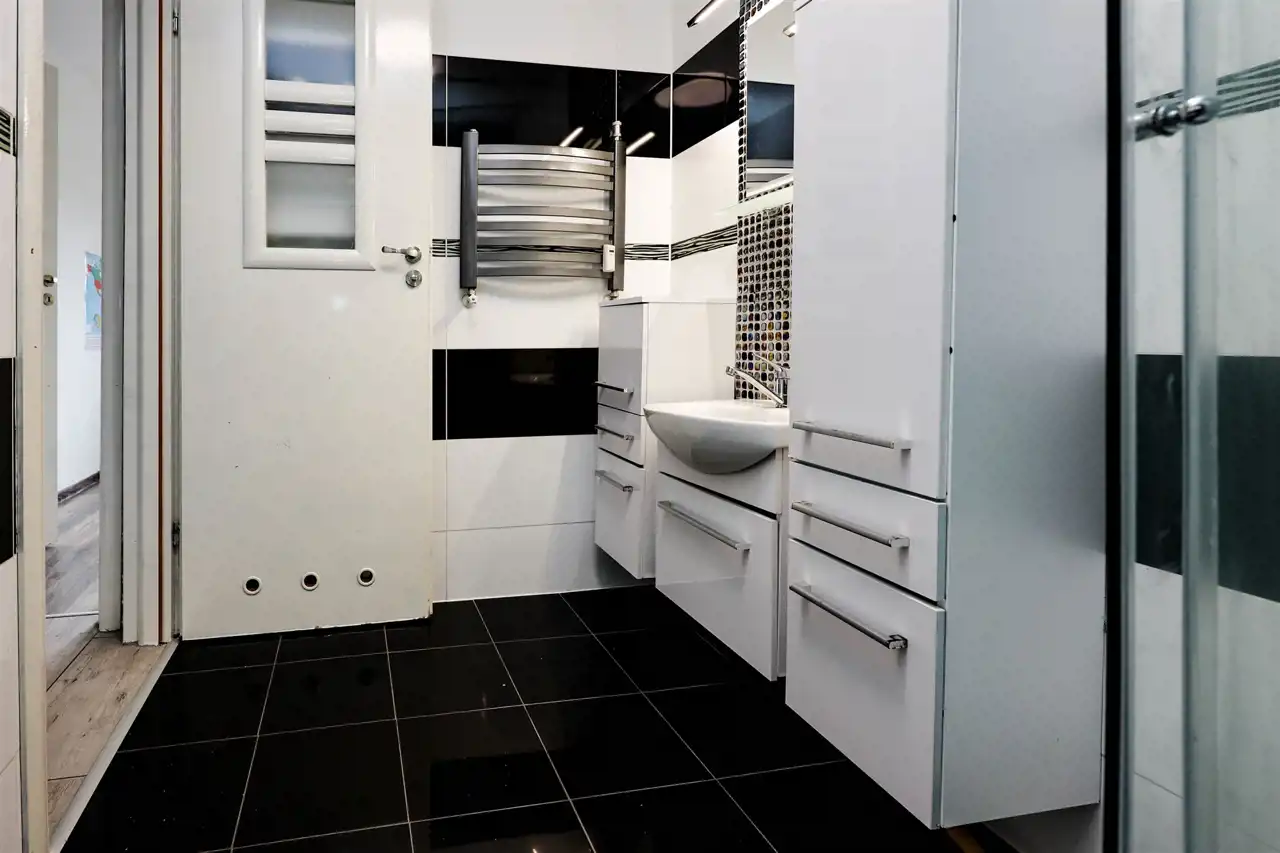 łazienka z dużym prysznicem, miejscem na pralkę i suszarkę, tutaj nowoczesność łączy się z wygodą, oddzielne wc z umywalką,