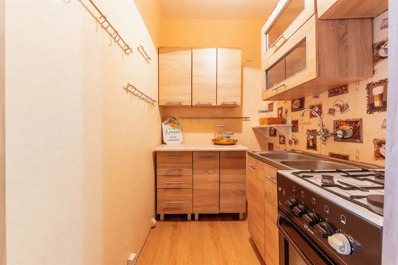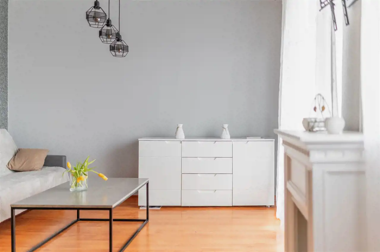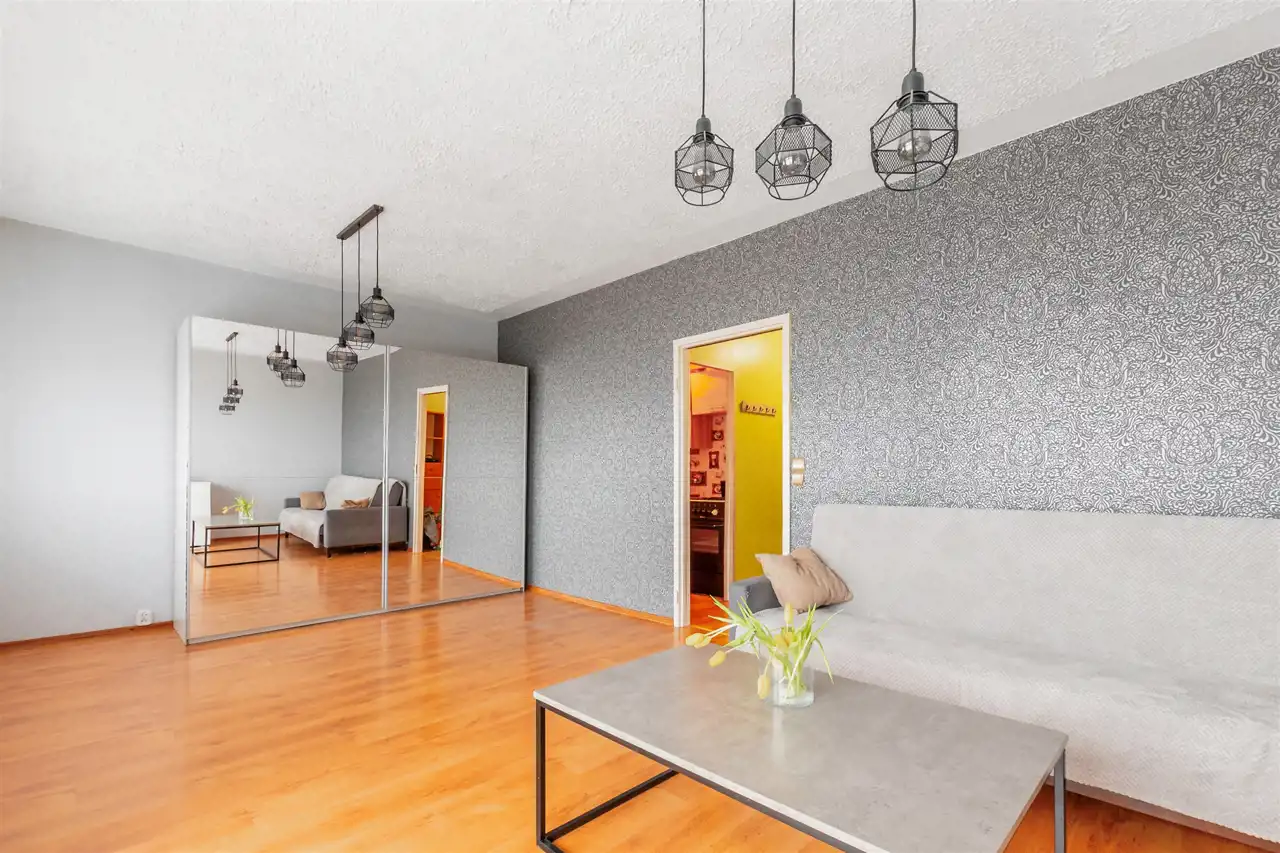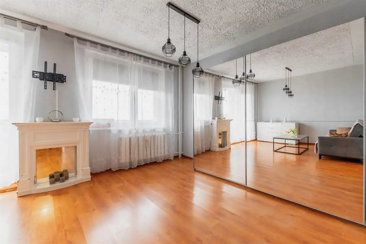 W pokojach znajdują się tapety oraz panele podłogowe. Wszystkie rzeczy widoczne w mieszkaniu pozostają w cenie – lokal sprzedawany jest z pełnym wyposażeniem.
