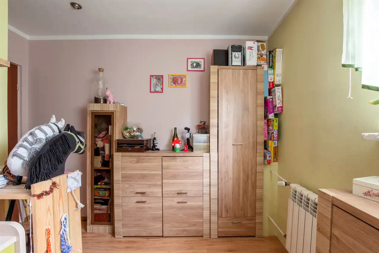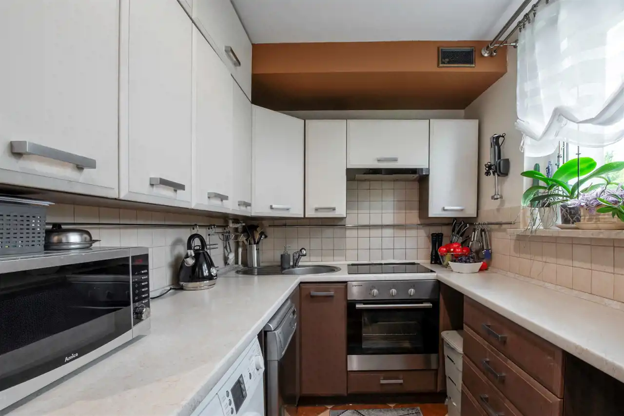 Elementy stałe zabudowy (m.in. meble kuchenne, szafy wnękowe) pozostają na wyposażeniu mieszkania i są wliczone w cenę.