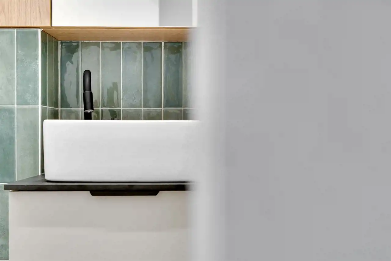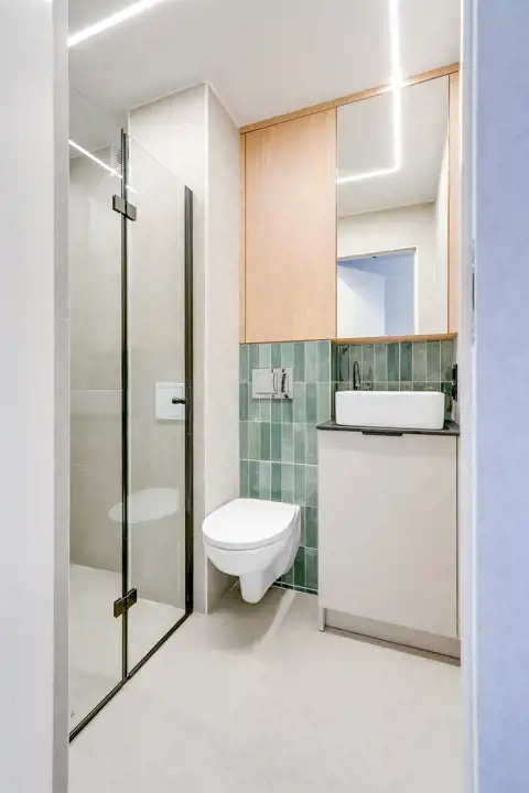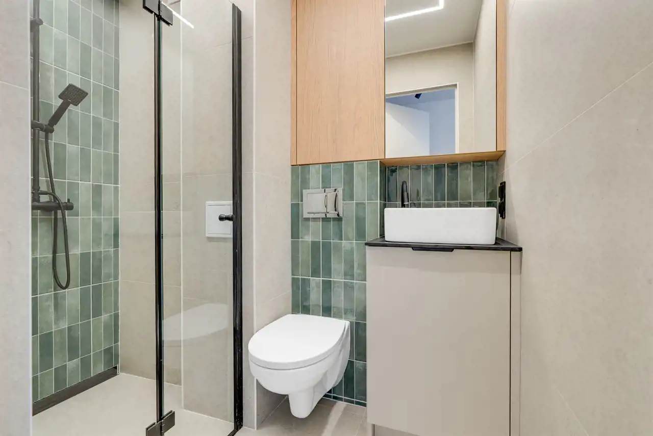 • Nowoczesna łazienka z prysznicem – urządzona w spójnym, minimalistycznym stylu,