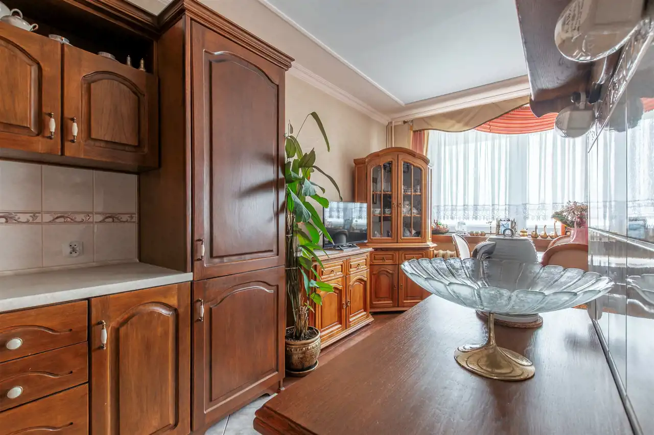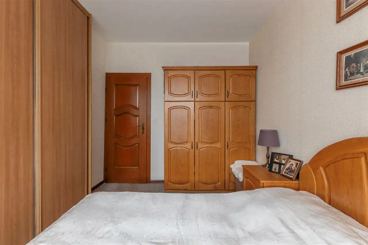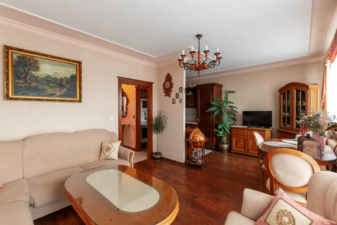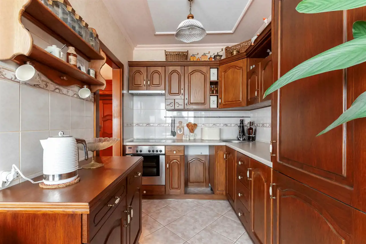 Dębowa kuchnia, ościeżnice z litego drewna wykonywane na specjalne zamówienie, wysokiej klasy meble robione przez stolarza - prawdziwe rzemiosło, które dziś spotyka się coraz rzadziej. Całość dopełnia subtelna sztukateria. Do dyspozycji również duży balkon typu loggia, idealny na chwilę wytchnienia.
