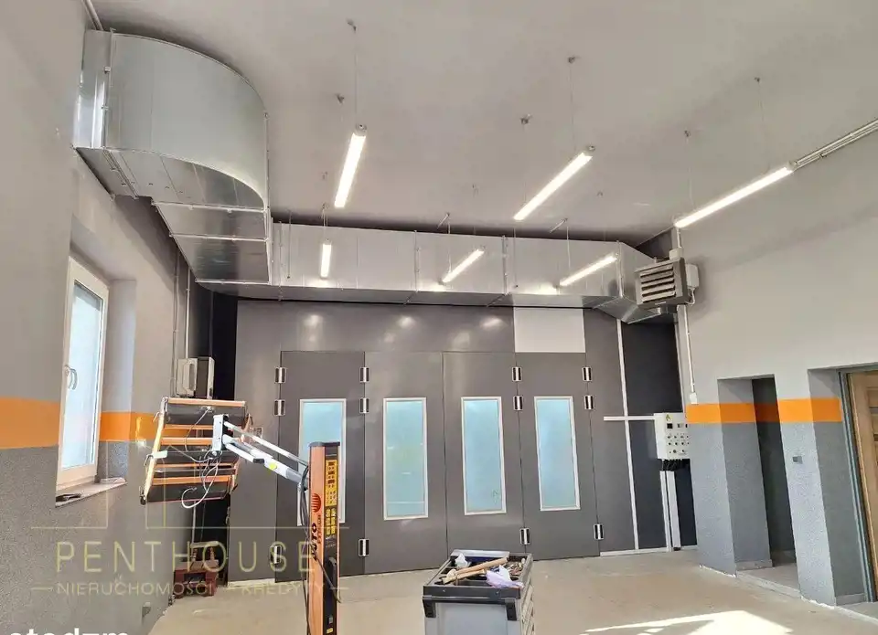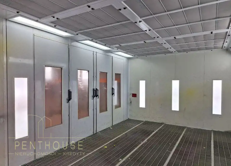 Rozkład powierzchni warsztatowej: lakiernia, hala wymiany opon, hala warsztatowa, hala serwisowa, zaplecze socjalne, biuro, kuchnia, wc