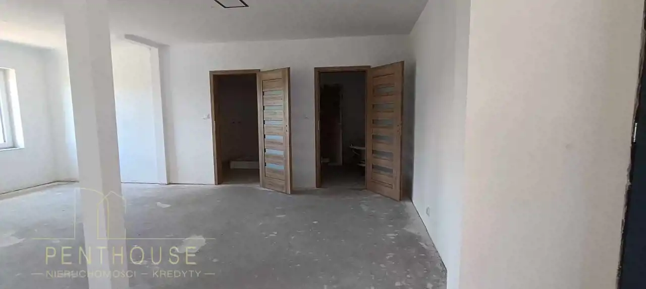 Rozkład mieszkania nad warsztatem: 2 łazienki, pomieszczenie gospodarcze, kuchnia, duże pomieszczenie do wydzielenia na salon, 2 sypialnie