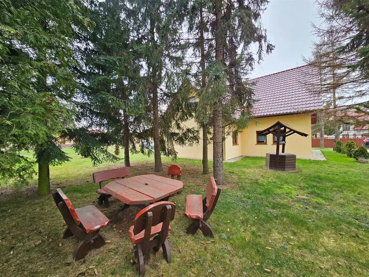 Dużym atutem nieruchomości jest ogród ze starodrzewiem i okazałymi świerkami – idealne miejsce do wypoczynku i stworzenia prywatnej, zielonej przestrzeni.