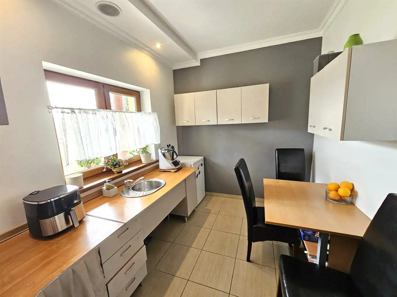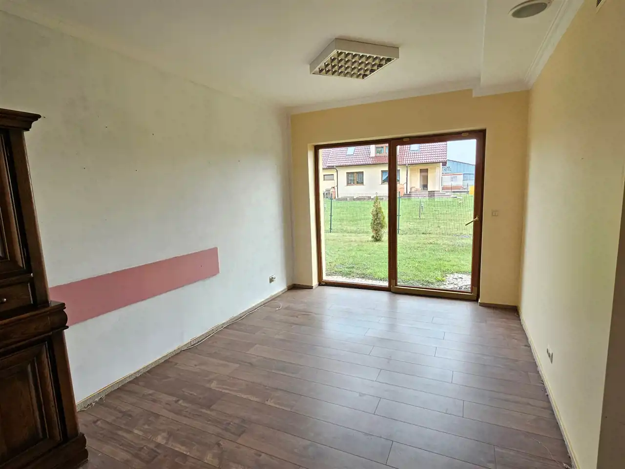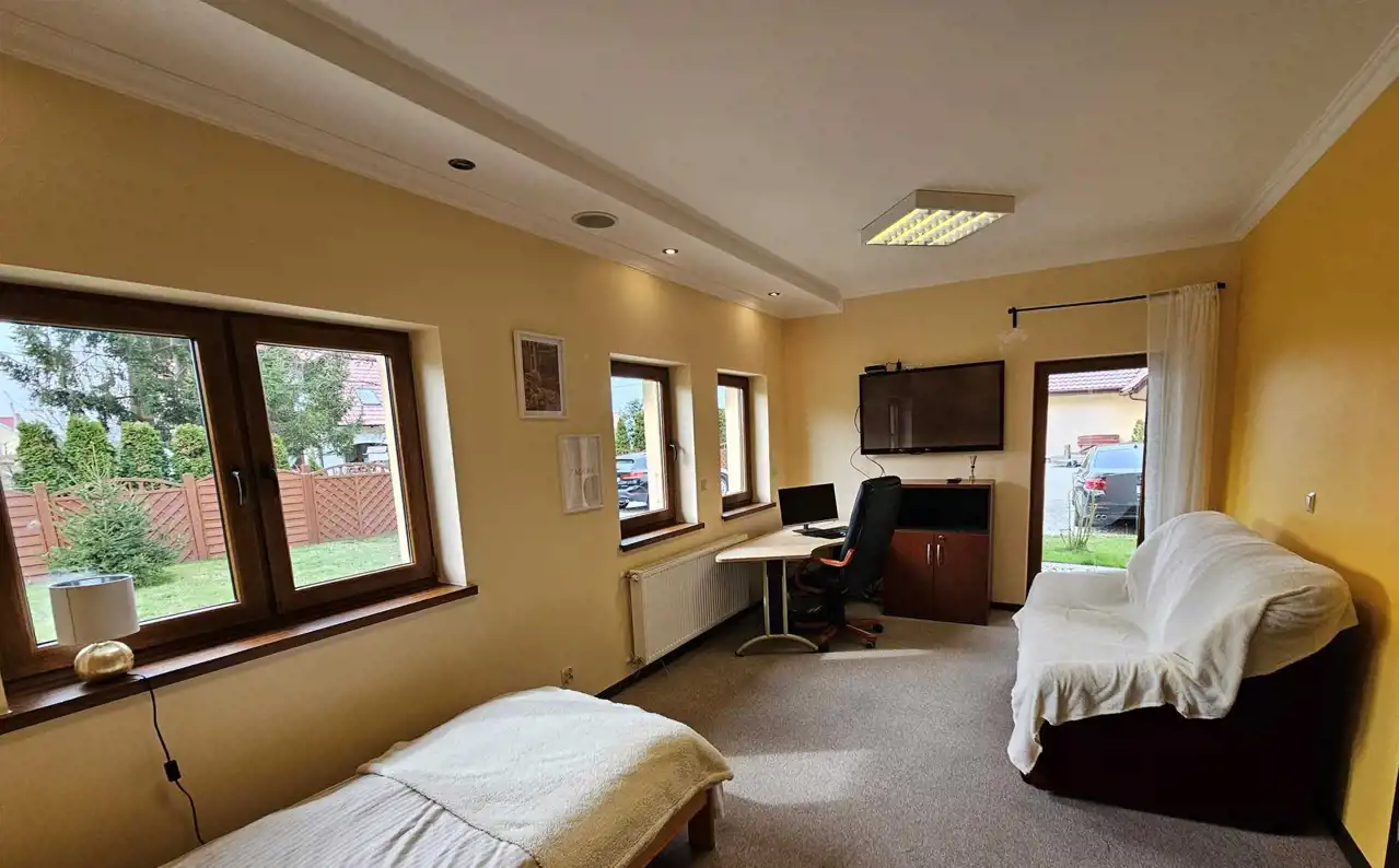 Parter: przedpokój, toaleta, pomieszczenie gospodarcze, kuchnia oraz dwa pokoje z wyjściem na zewnątrz. W miejscu pierwotnego garażu urządzono duży dodatkowy pokój.