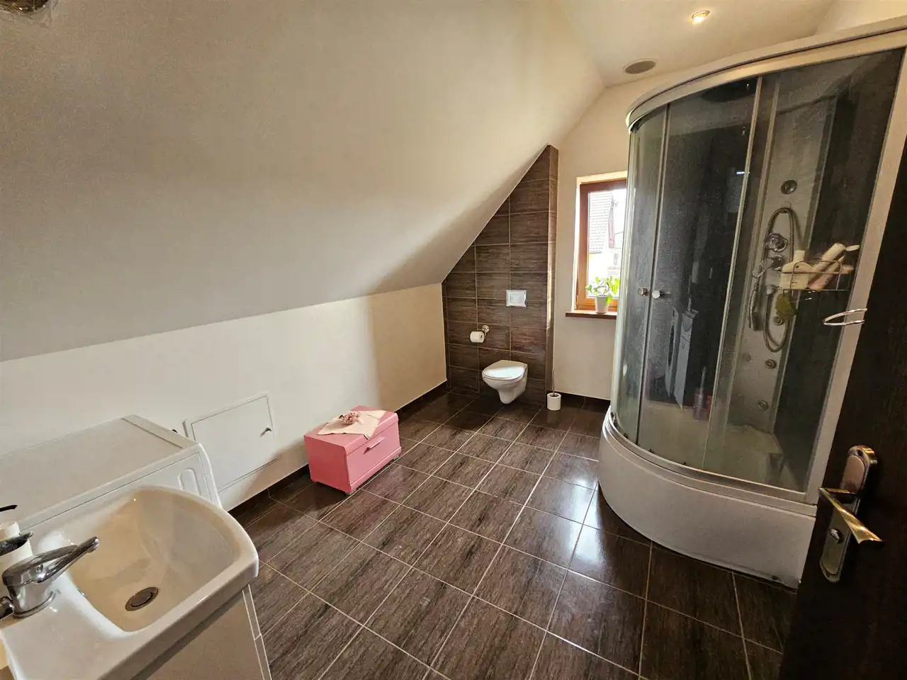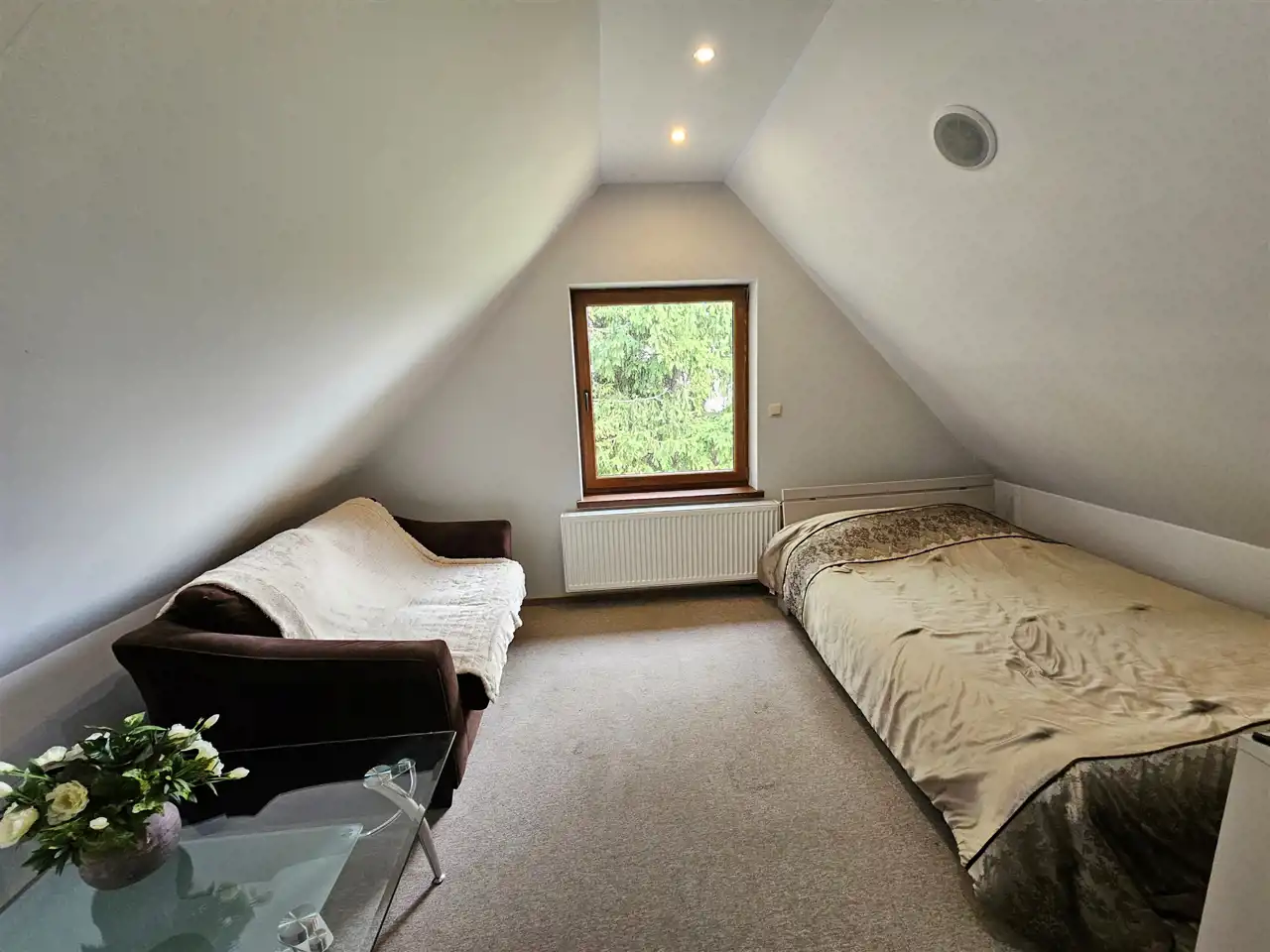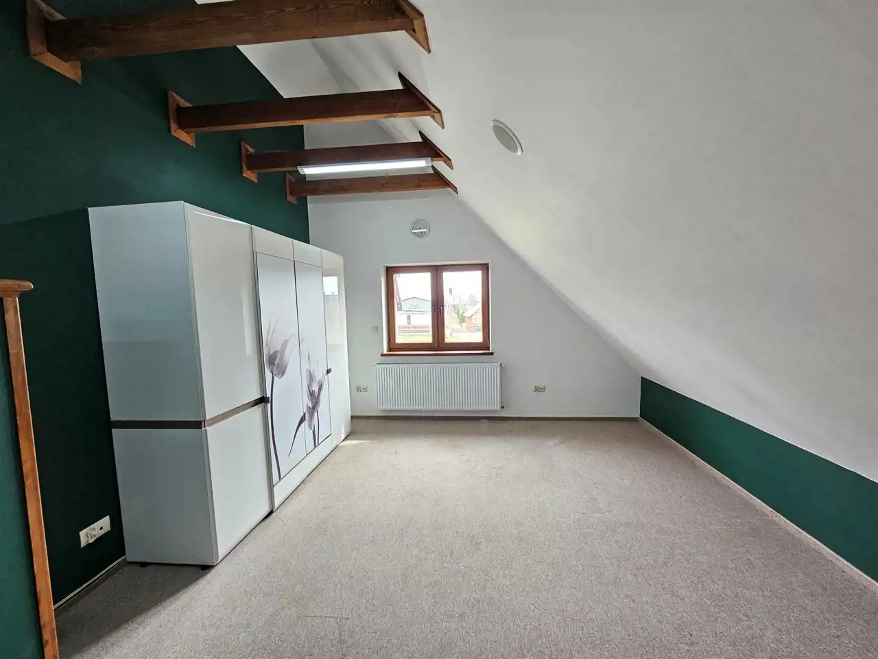 Poddasze: pokój, łazienka oraz dużą otwartą przestrzeń, którą można podzielić nawet na trzy niezależne pomieszczenia.