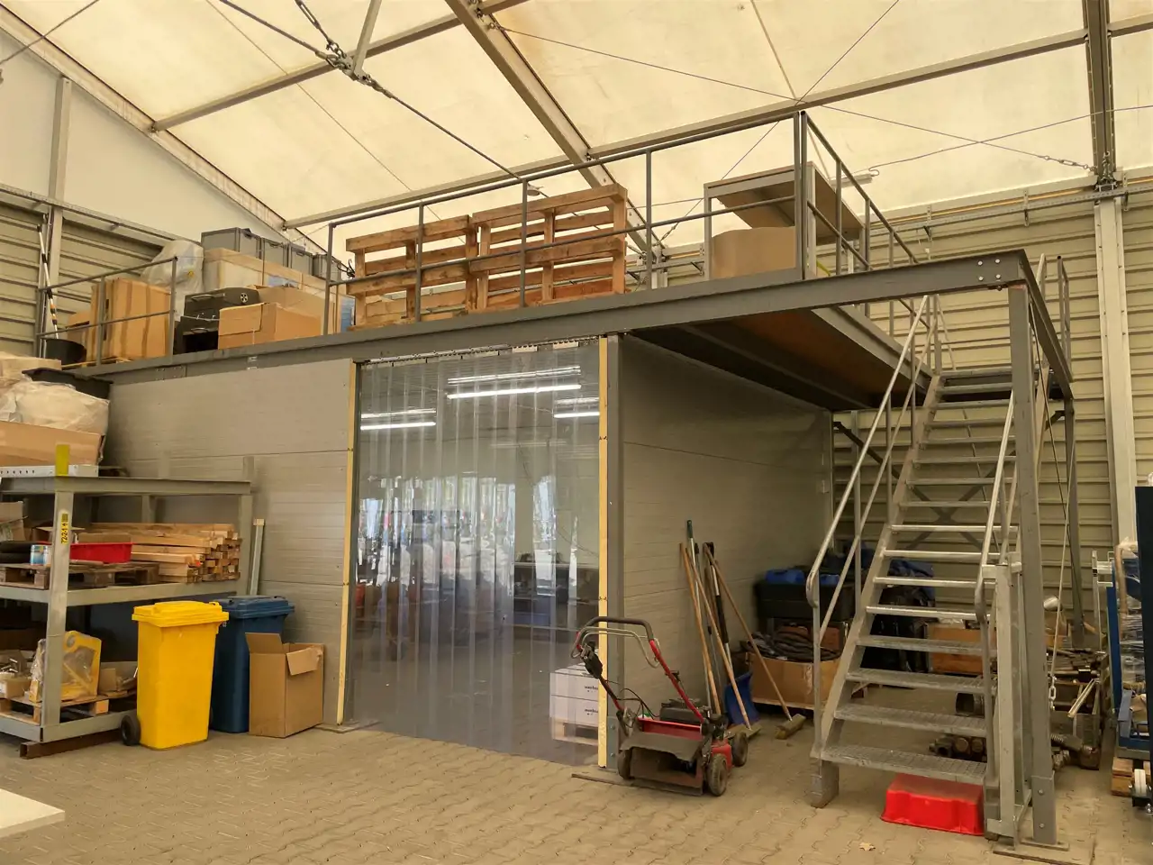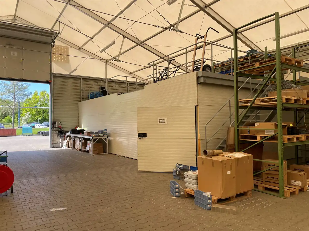 - hala nr 3 – 800,0 mkw p.u., wymiar 20,0m x 20,0 m x wys. 8,25 m, przeznaczenie magazynowe, konstrukcja stalowa, ściany oraz dach kryte tkaniną poliestrową, posadzka wykonana z kostki brukowej, antresola w rogu halu