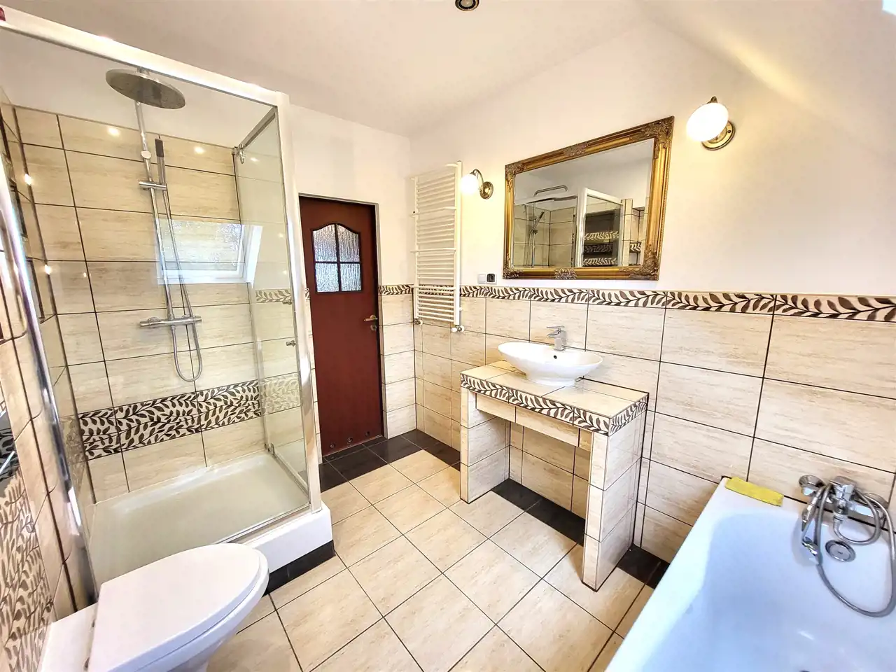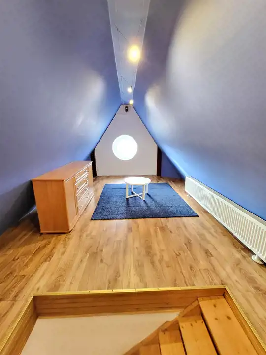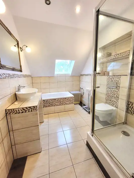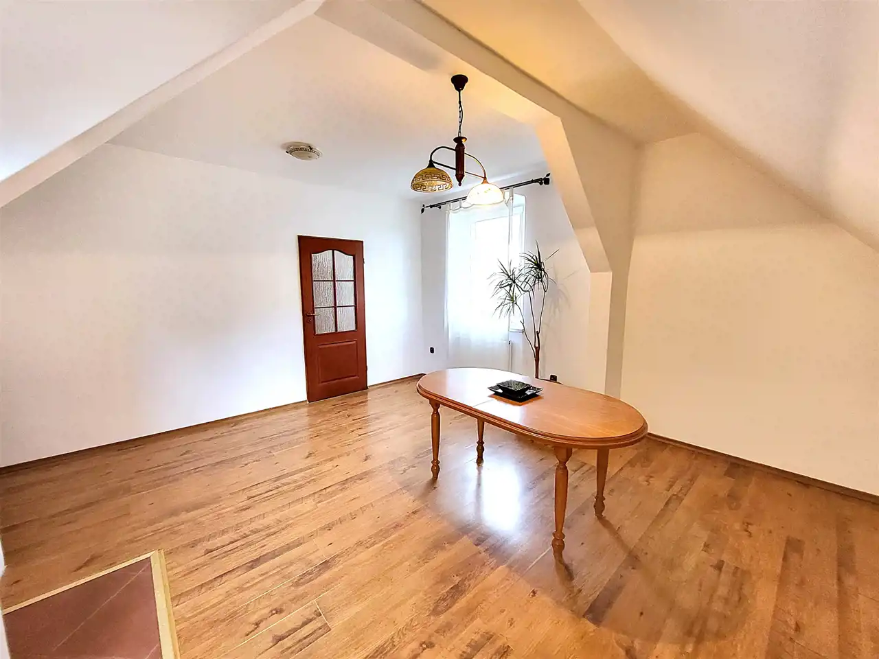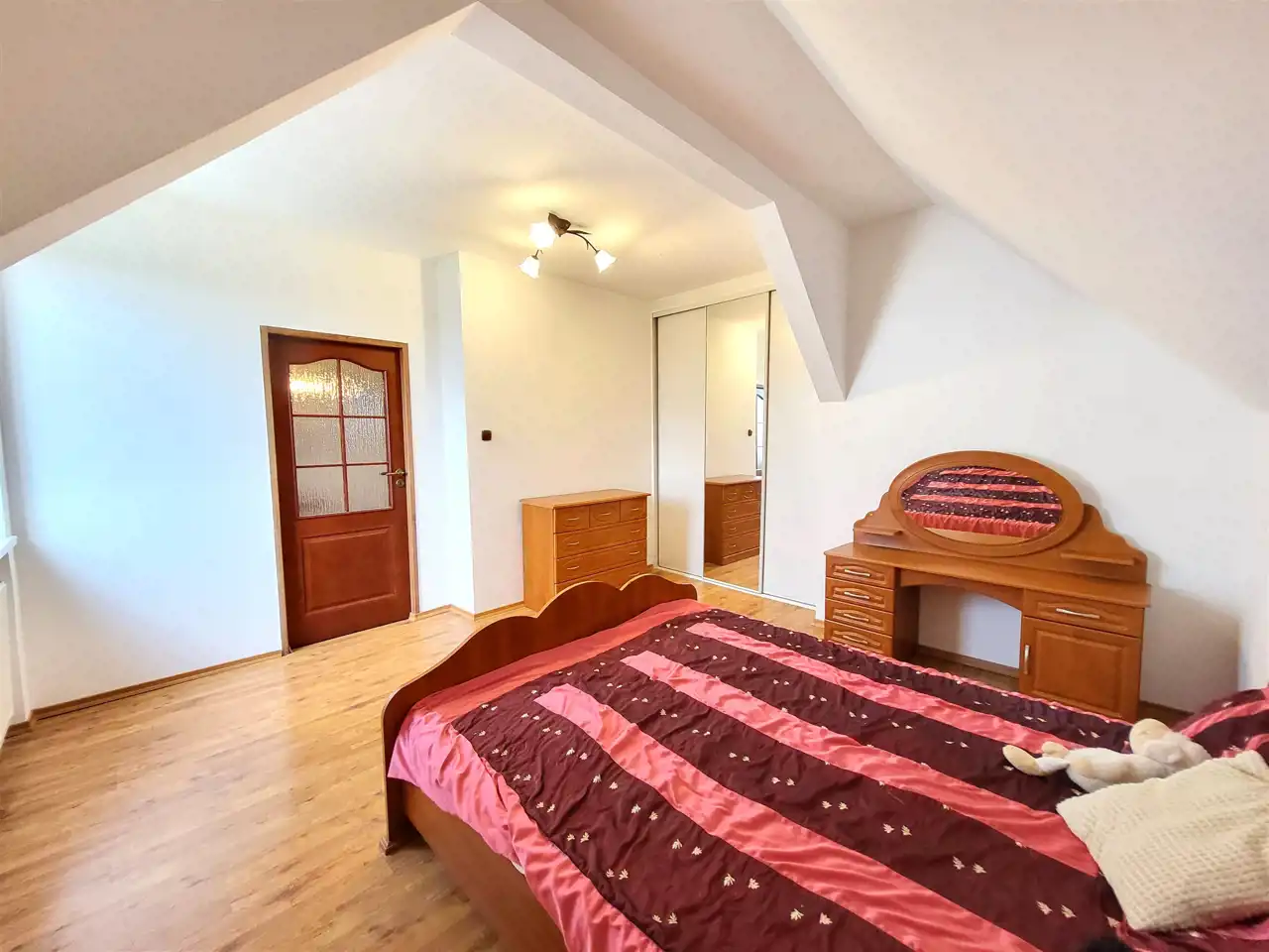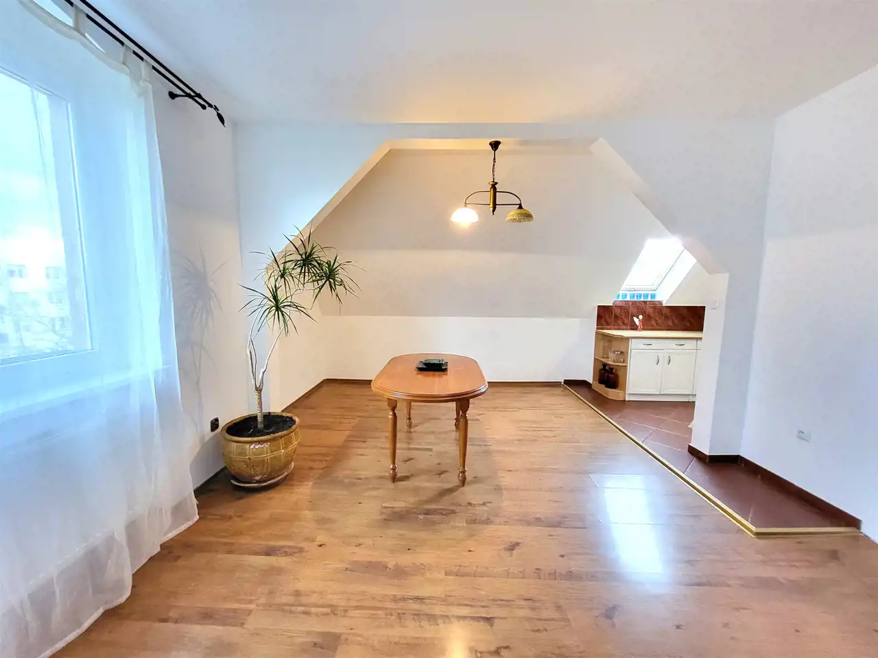 Lokal składa się z: dużego salonu, dwóch przytulnych sypialni (w jednej duża szafa na wymiar), kuchni połączonej z jadalnią, łazienki z WC, kabiną prysznicową oraz wanną, przedpokoju z rozsuwaną szafą oraz pomieszczenia gospodarczego. Dodatkowo z części poddasza został wydzielony czwarty pokój o powierzchni ok 15 m2! Do mieszkania przynależy również piwnica.
