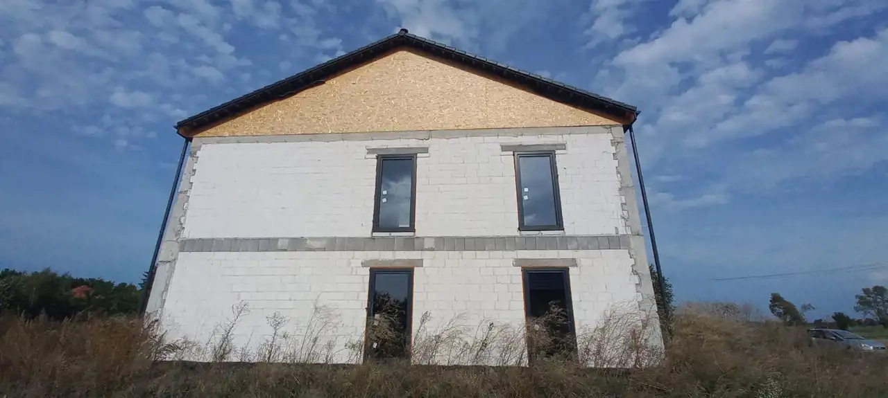 Wykonany w tradycyjnej technologii murowanej, ocieplony styropianem (18 cm), z dachem dwuspadowym, ten dom oferuje solidność i nowoczesne rozwiązania. Tynki wewnętrzne maszynowe, zewnętrzne typu sisi .