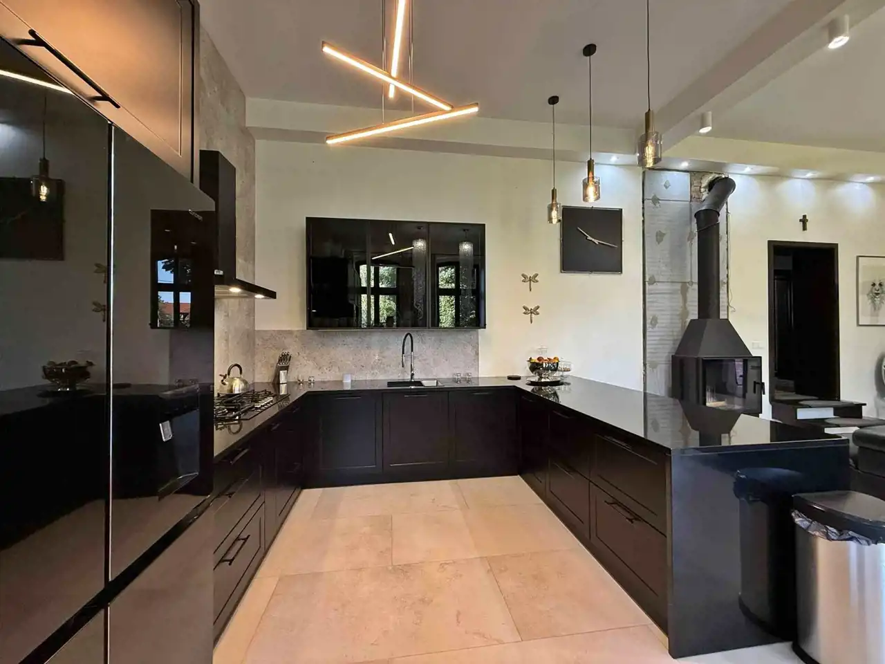 W cenie piękna zabudowa kuchenna- meble, wyspa, sprzęty w zabudowie i lodówka wolnostojąca, szafy w pokoju i wiatrołapie w zabudowie.