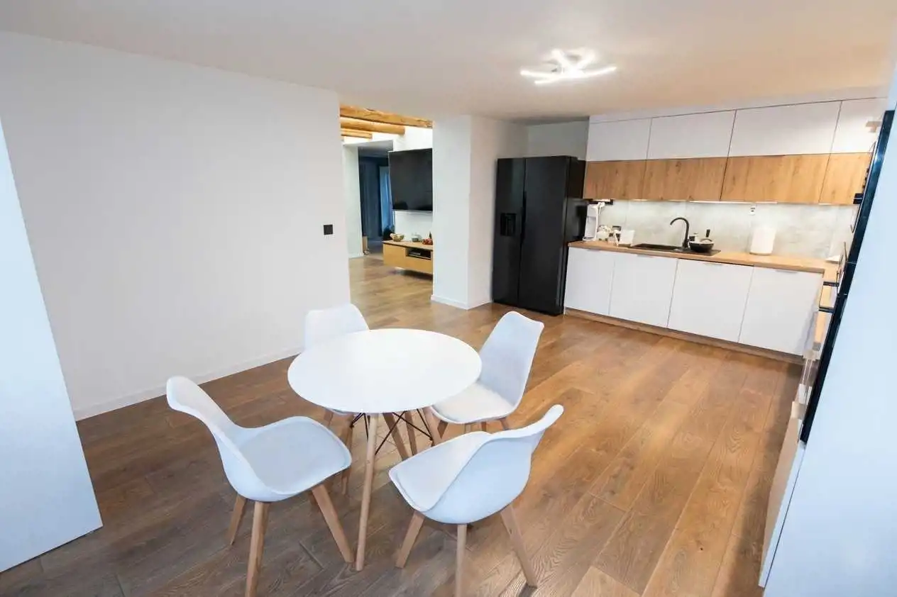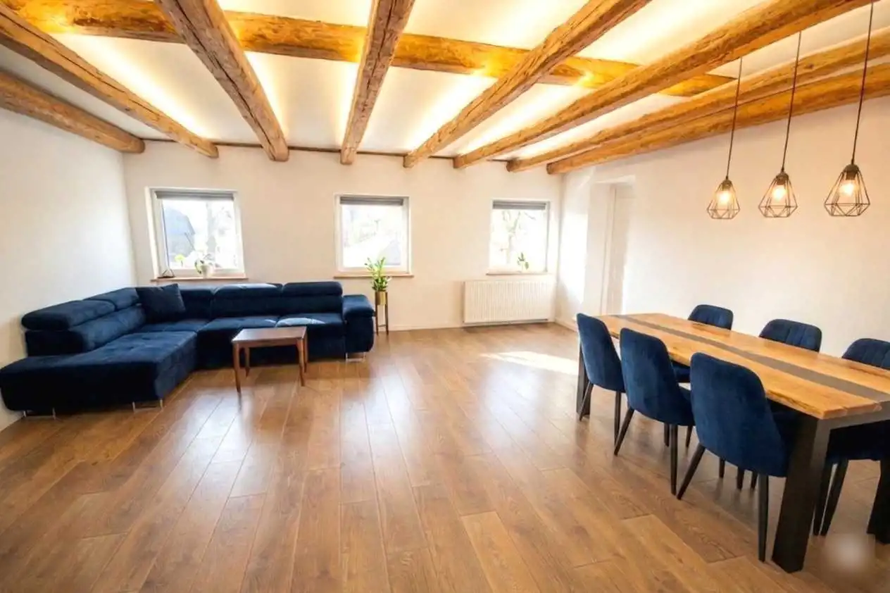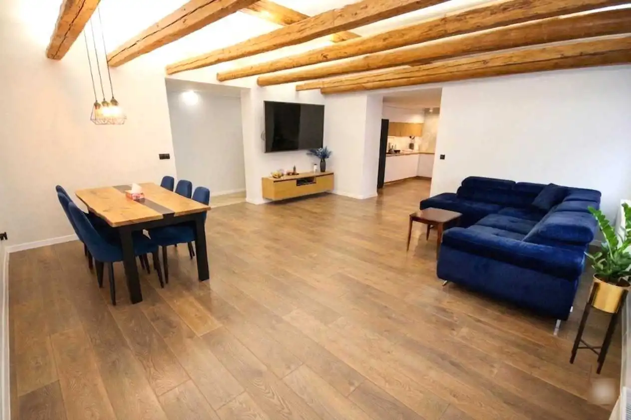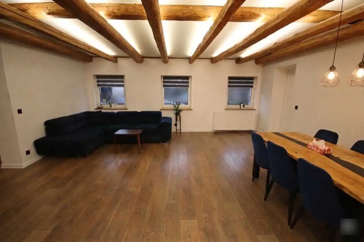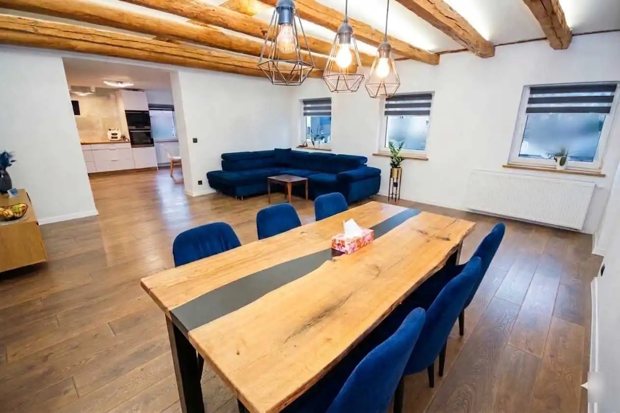 - Sercem salonu są zachowane, oryginalne drewniane belki, które dzięki subtelnemu podświetleniu budują niesamowity klimat. To połączenie loftowego stylu z przytulnością, dodaje wnętrzu charakteru i uroku;
