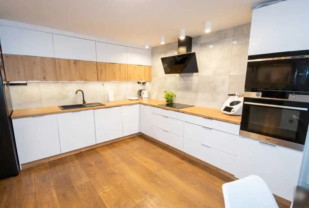 - W kuchni meble w zabudowie z wyposażeniem AGD (płyta indukcyjna, zmywarka, piekarnik, mikrofala) - w cenie;