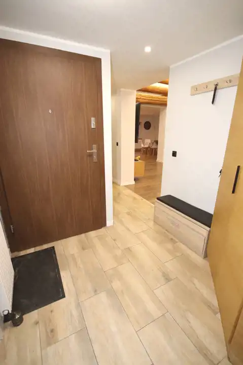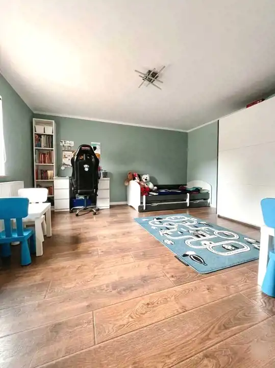 - W pokojach i kuchni panele podłogowe, a w przedpokoju i w łazience płytki; okna PCV; wymienione instalacje; drewniane parapety; ściany od środka ocieplone wełną, a sufit celulozą;