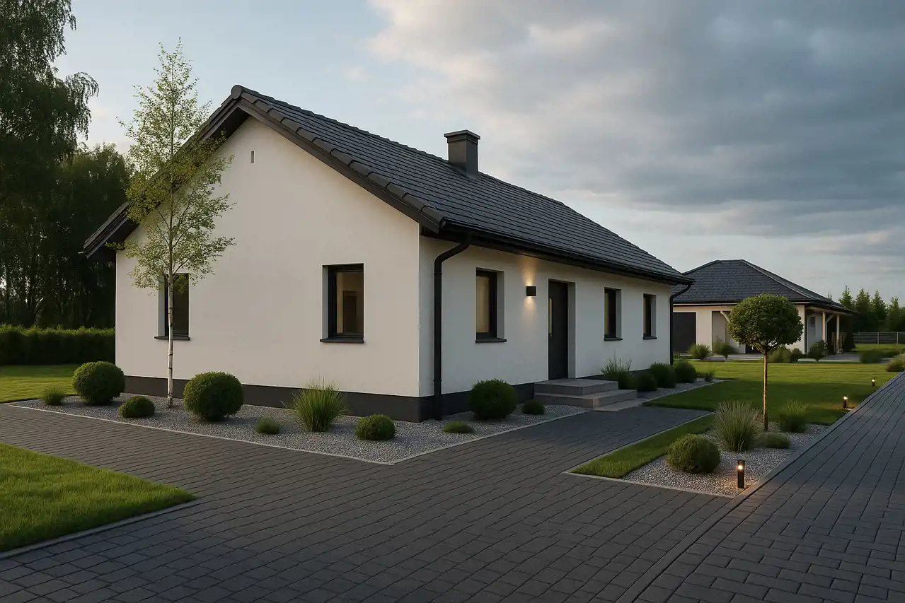 Ocieplona podmurówka – Aqua styropian 15 cm, rynny PVC 80, strop to nie byle co, tylko monolit (czyli porządna robota), a na dachu blachodachówka model TREND – wygląda, jakby dopiero co z katalogu zjechała.