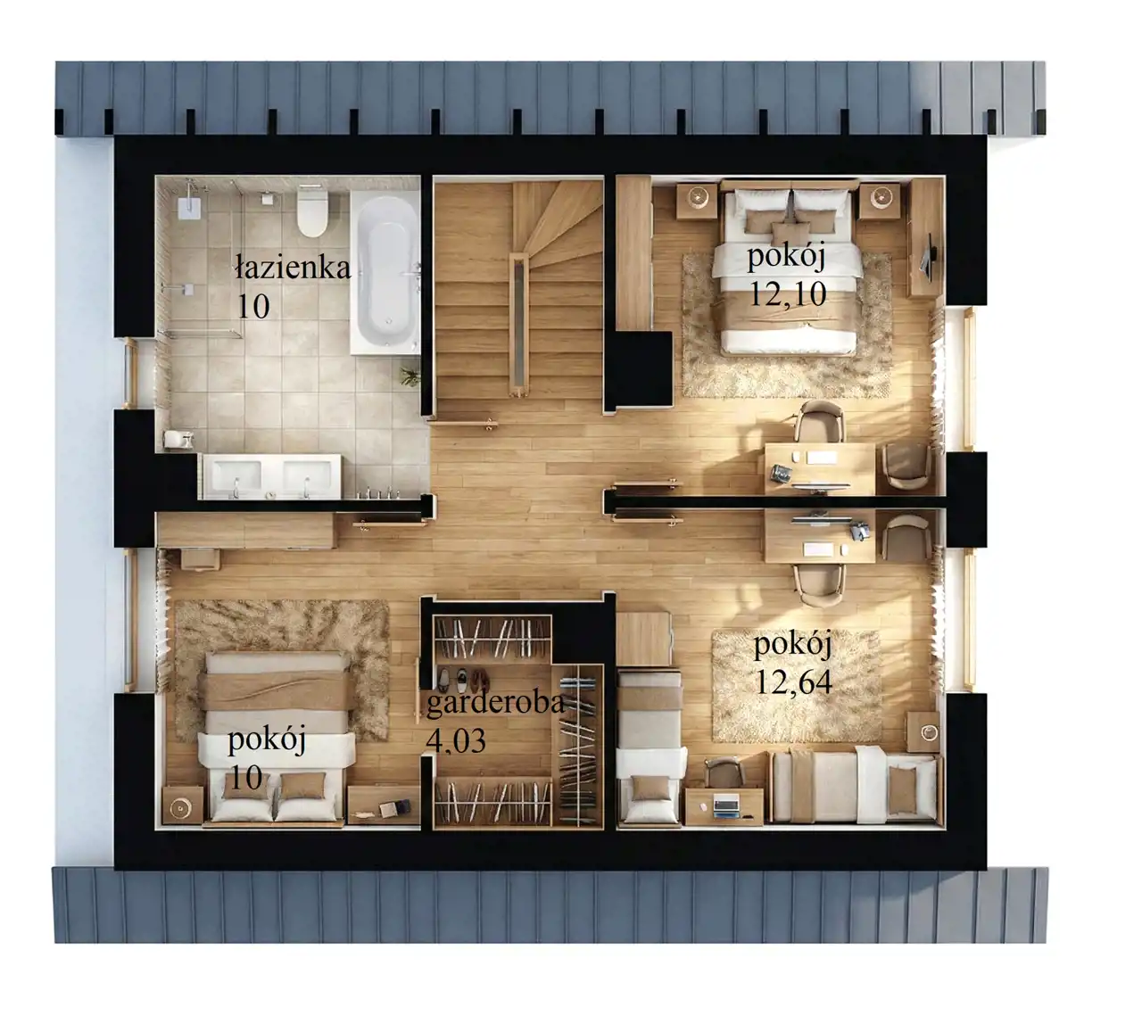 Poddasze: trzy ustawne sypialnie oraz duża łazienka. Dodatkowo 4 balkony francuskie zapewniające dopływ światła.