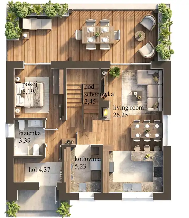 Parter: przestronny salon z jadalnią i bezpośrednim wyjściem na taras, kuchnia, spiżarnia pod schodami, dodatkowy pokój (gabinet/sypialnia), łazienka oraz kotłownia.