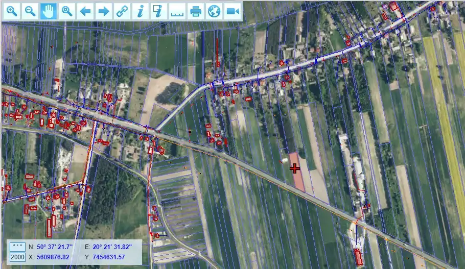The plot is located in a convenient transportation hub (Jędrzejów-Chmielnik route), with surrounding areas mainly consisting of open fields and single-family houses