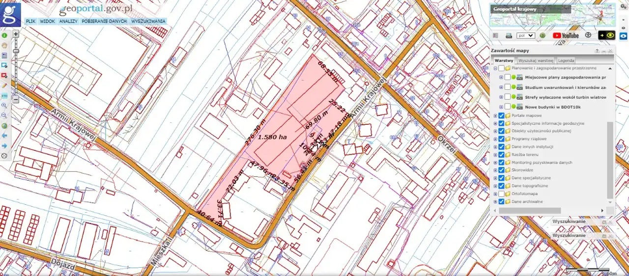 For sale: an investment plot of land with an area of 16,194 square meters, located in Jędrzejów at Armii Krajowej Ave. The plot has an irregular shape and access from two sides. The front of the plot is approximately 160 meters long. There are old buildings on the plot suitable for demolition. The terrain is hardened and flat. The plot has necessary connections (power, water supply, rainwater and sanitary sewage, gas, and district heating). There is no local spatial development plan for the area where the plot is situated—application for a building permit is required.