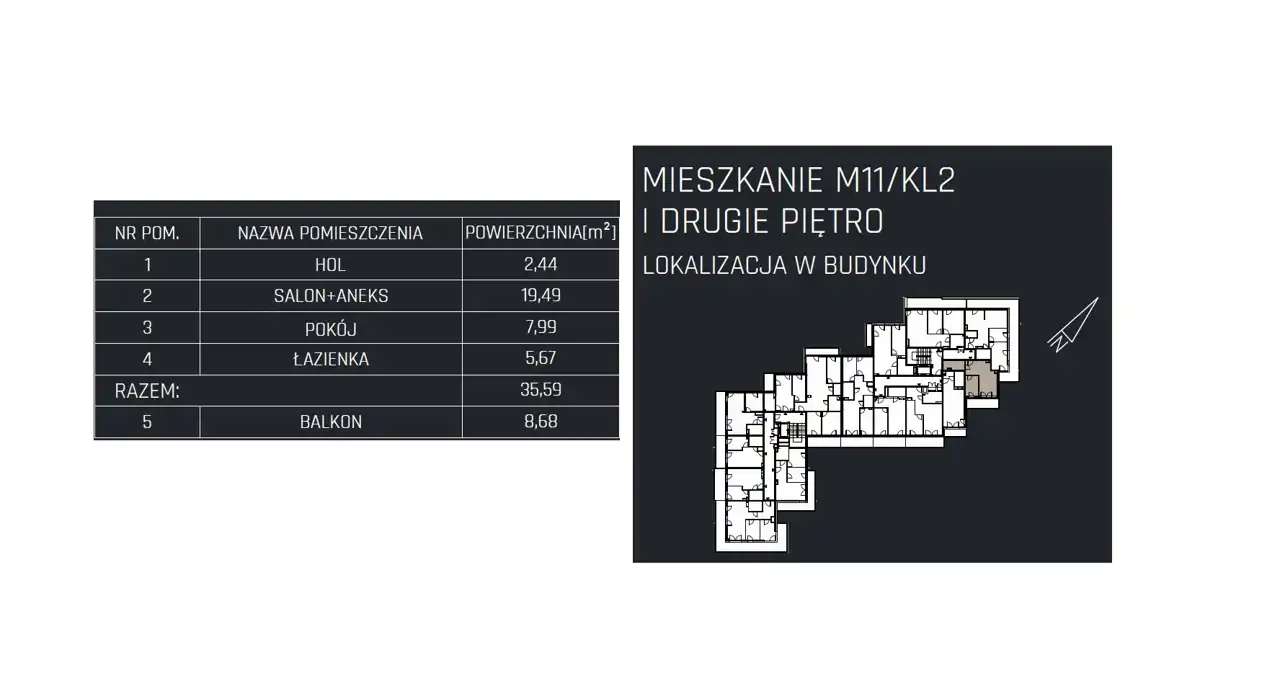 - Charakterystyka mieszkania 35.59 m2, 2 pokoje