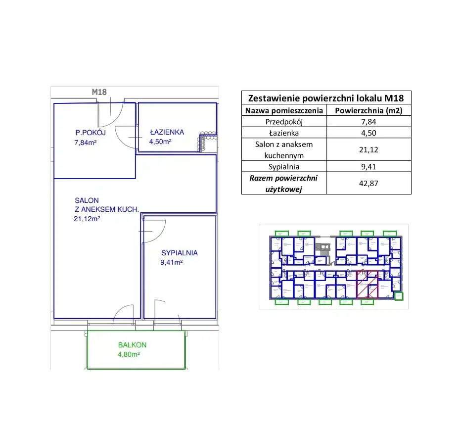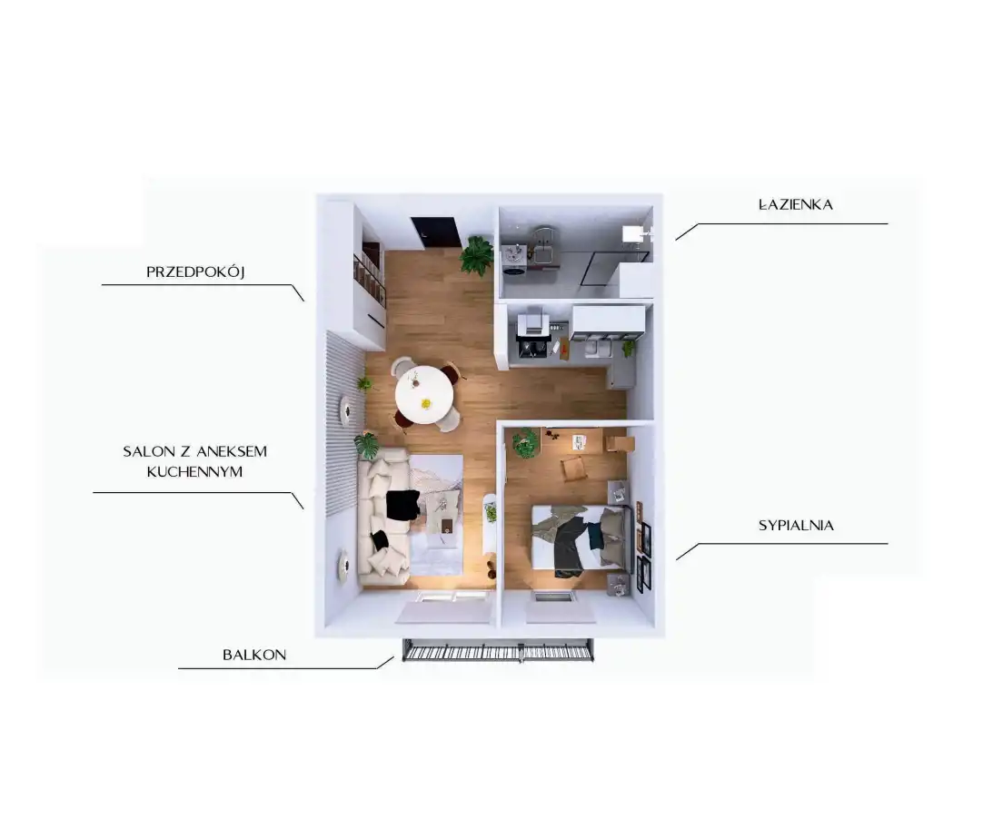 - Charakterystyka mieszkania 42.87 m2, 2 pokoje