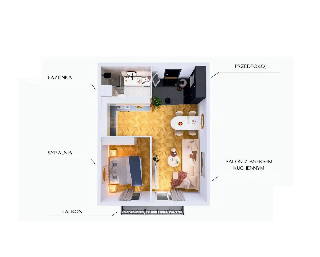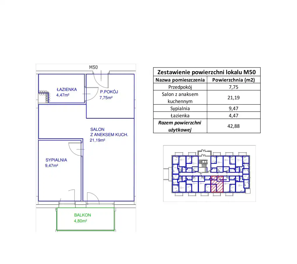 - Charakterystyka mieszkania 42.88 m2, 2 pokoje