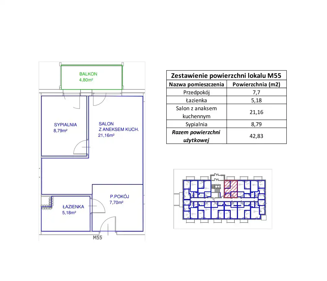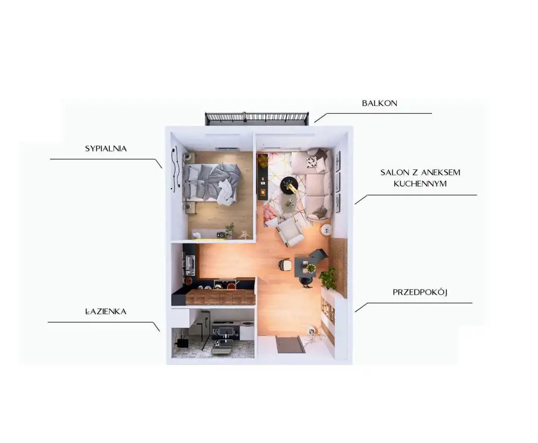 - Charakterystyka mieszkania 42.83 m2, 2 pokoje