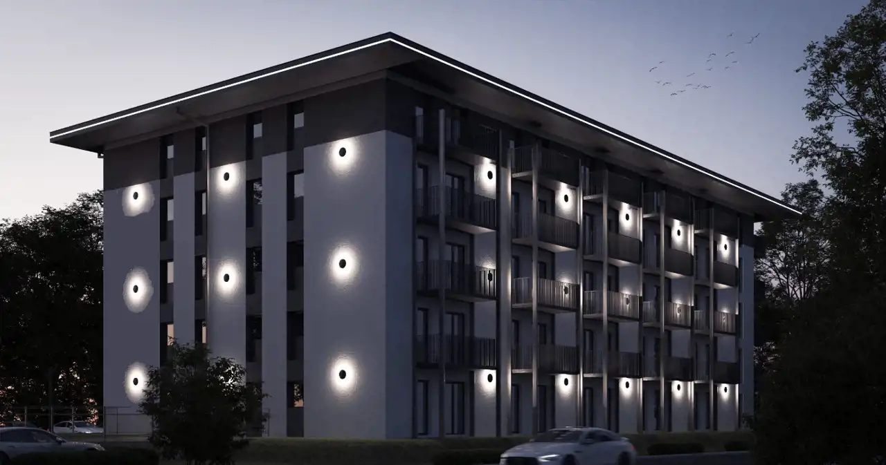 The development includes 55 apartments ranging from 42m² to 49m², situated in a four-story building. The units will be delivered to a high developer standard and will include underfloor heating, air conditioning, and a video intercom. Heating is provided by the municipal network, with hot water from a gas boiler supported by photovoltaics. Thoughtfully designed layouts ensure flexible interior arrangements. The development is located in the quiet Zachód estate area, close to various service and retail points, and a kindergarten. The website address referred to in Article 19a, paragraph 3 of the Act of 20 May 2021 on the protection of the rights of purchasers of residential premises or single-family houses and on the Developer Guarantee Fund is mieszkanialokum(dot)pl. The website address has been written phonetically.