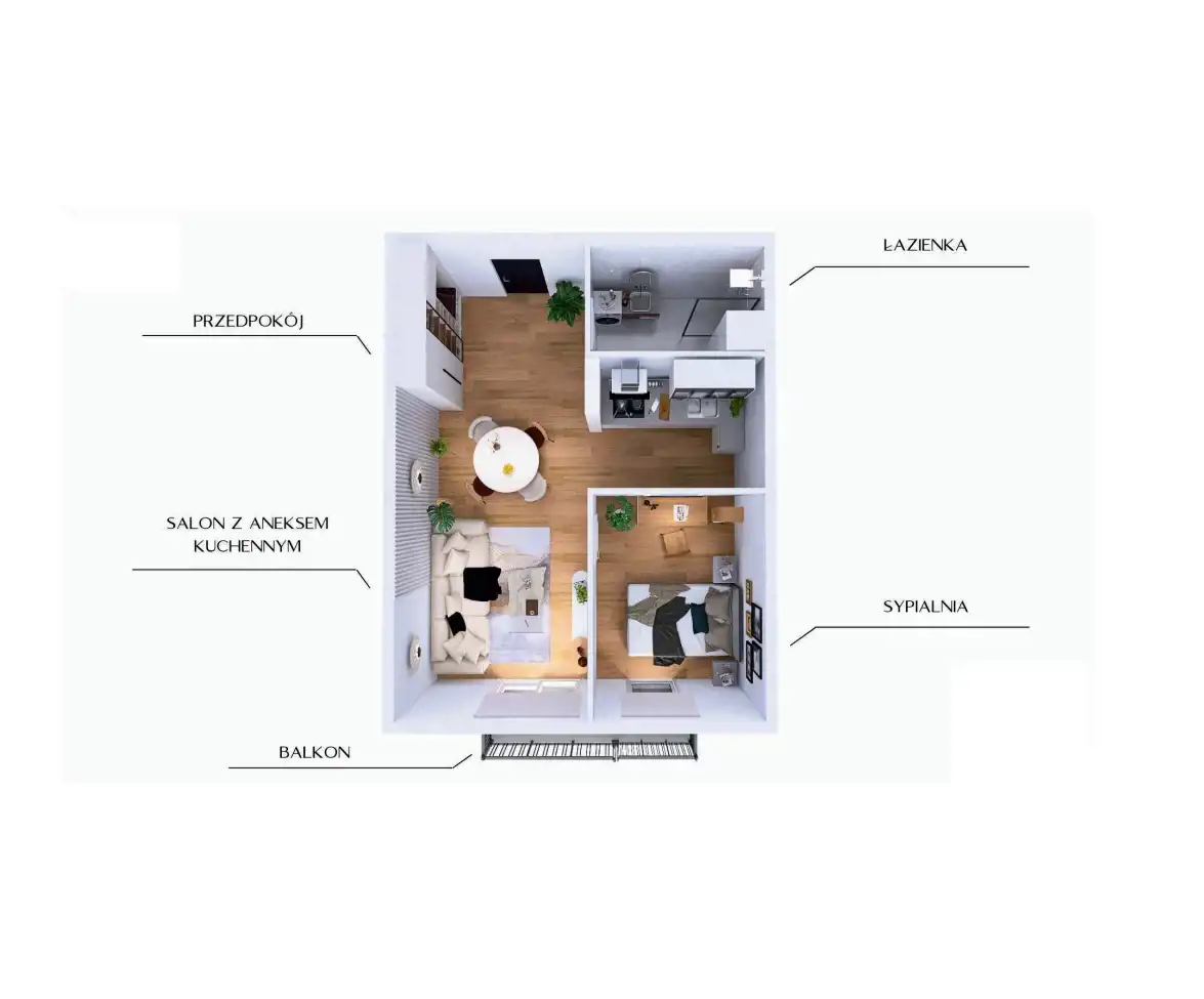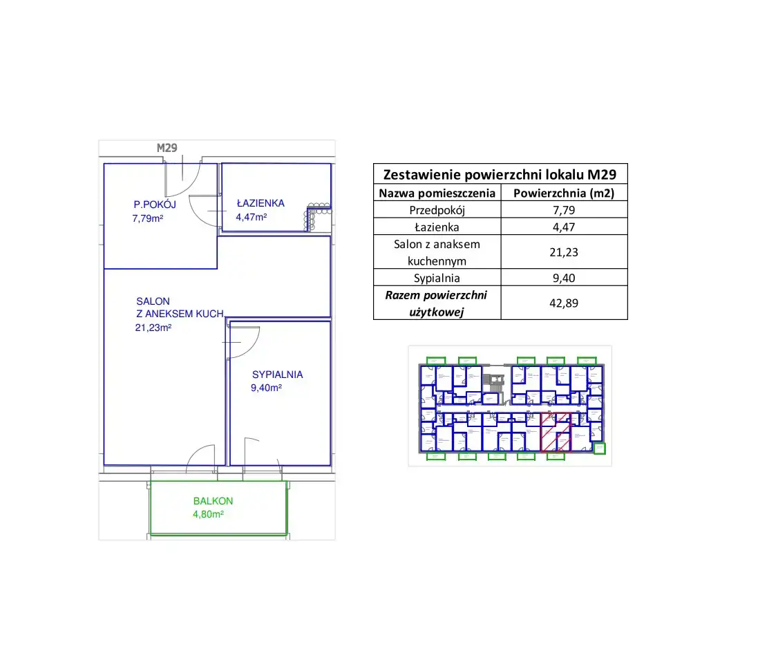 - Charakterystyka mieszkania 42.89 m2, 2 pokoje