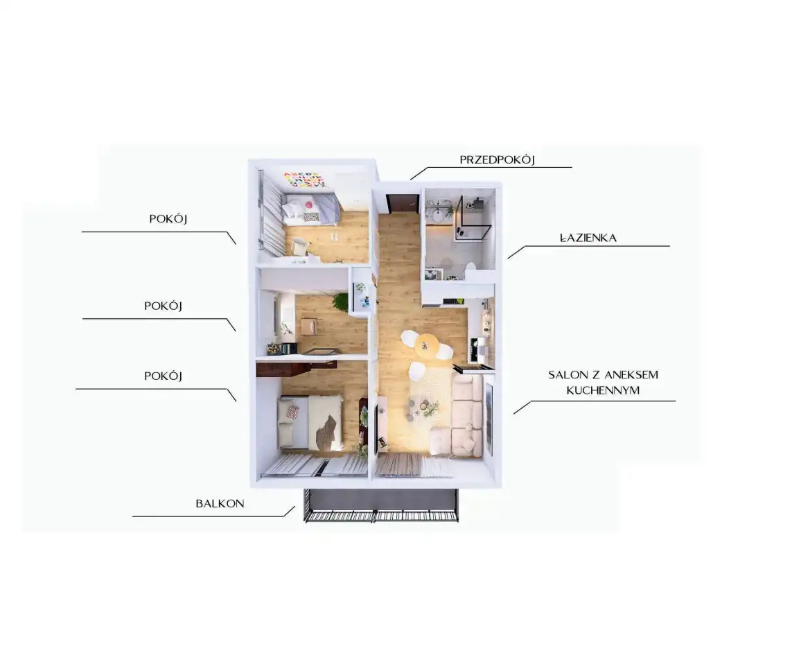 3 sypialnie o pow. 10,07m2, 6,32m2, 7,49m2,