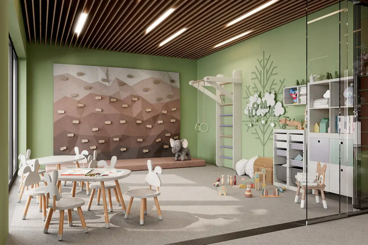 The complex includes 57 apartments in an apartment building with an integrated underground garage. The premises offer amenities such as: a gym, sauna, children’s playroom, DIY room, water treatment station, electric vehicle charging station, guest parking spaces and a restaurant.