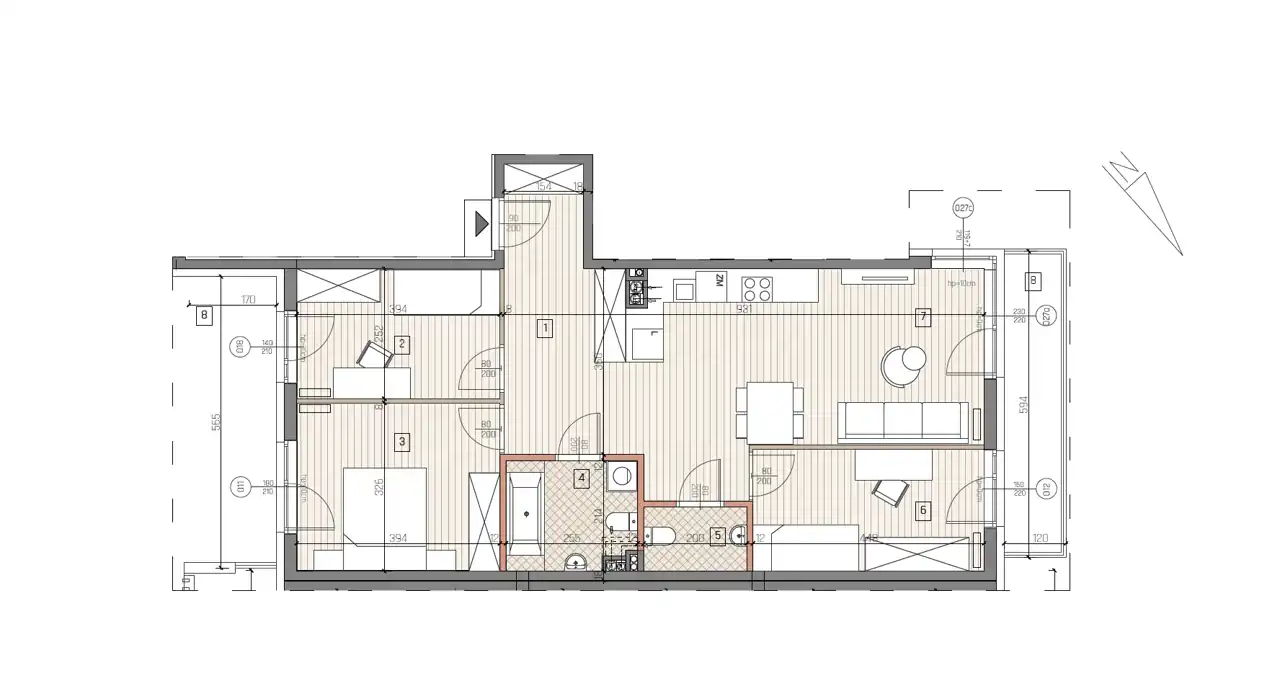 – 3 bedrooms with areas of 9.74m2, 10.37m2, 12.63m2,