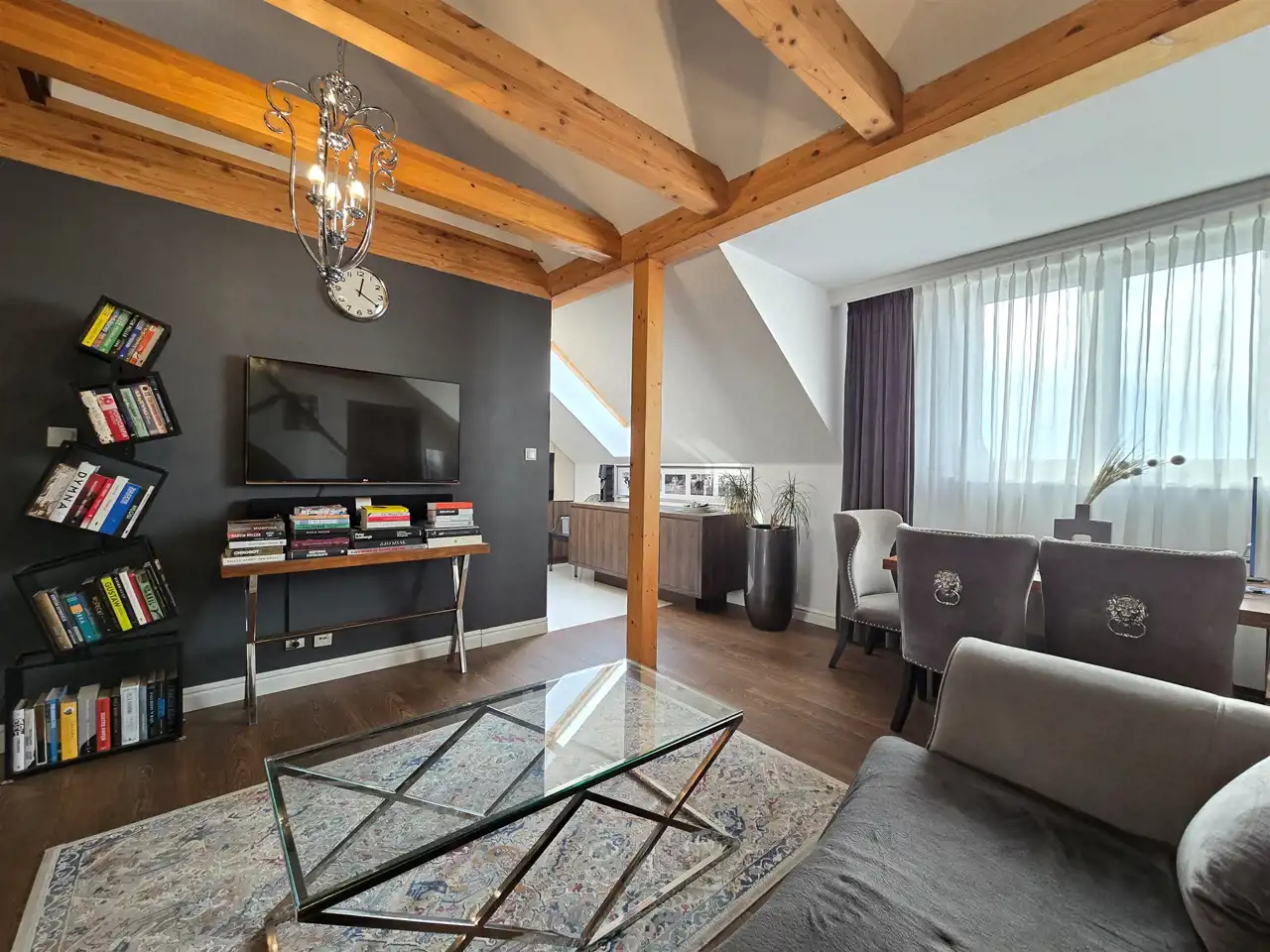 - przestronny, pięknie doświetlony salon, urządzony w eleganckim, spójnym stylu – miejsce, w którym przyjemnie odpoczywa