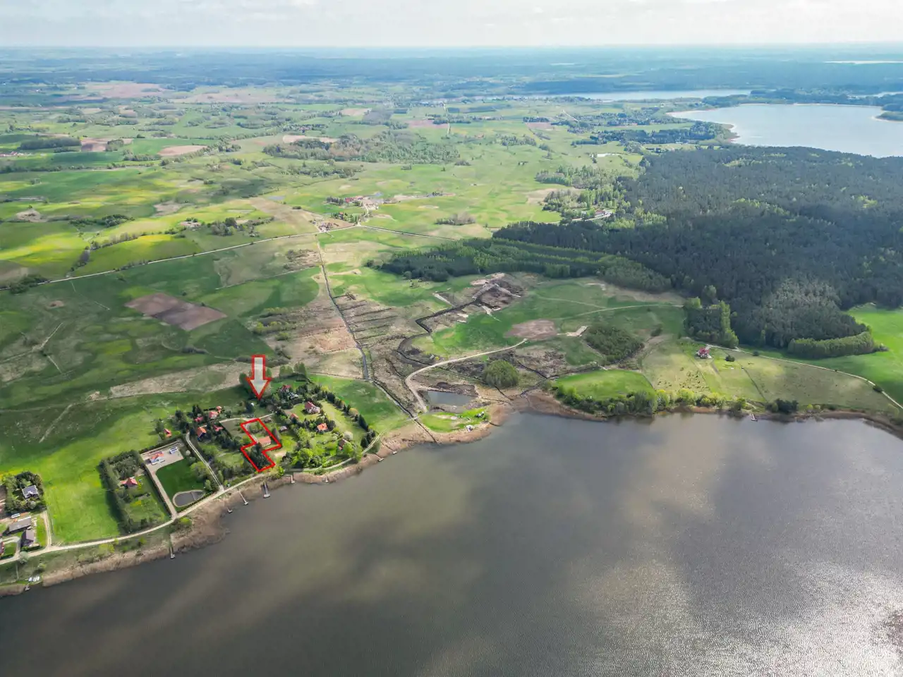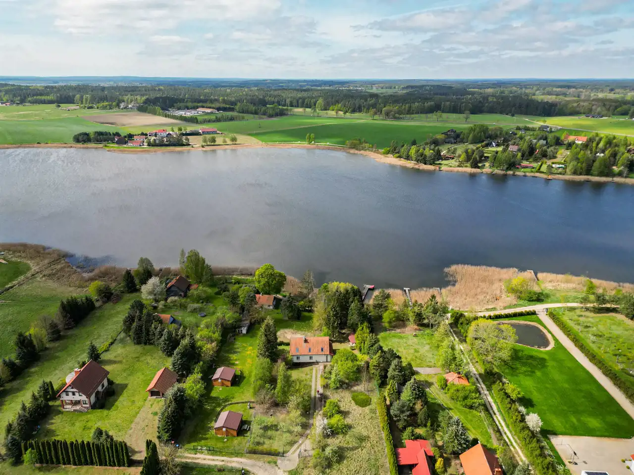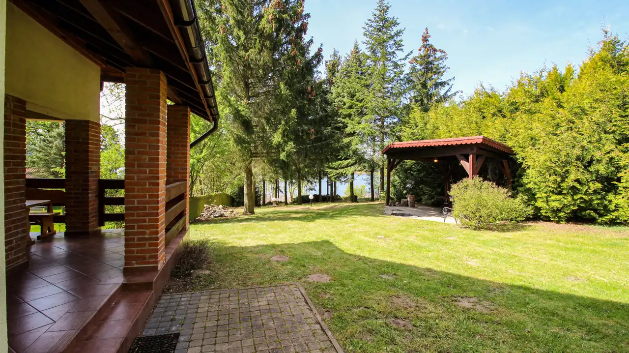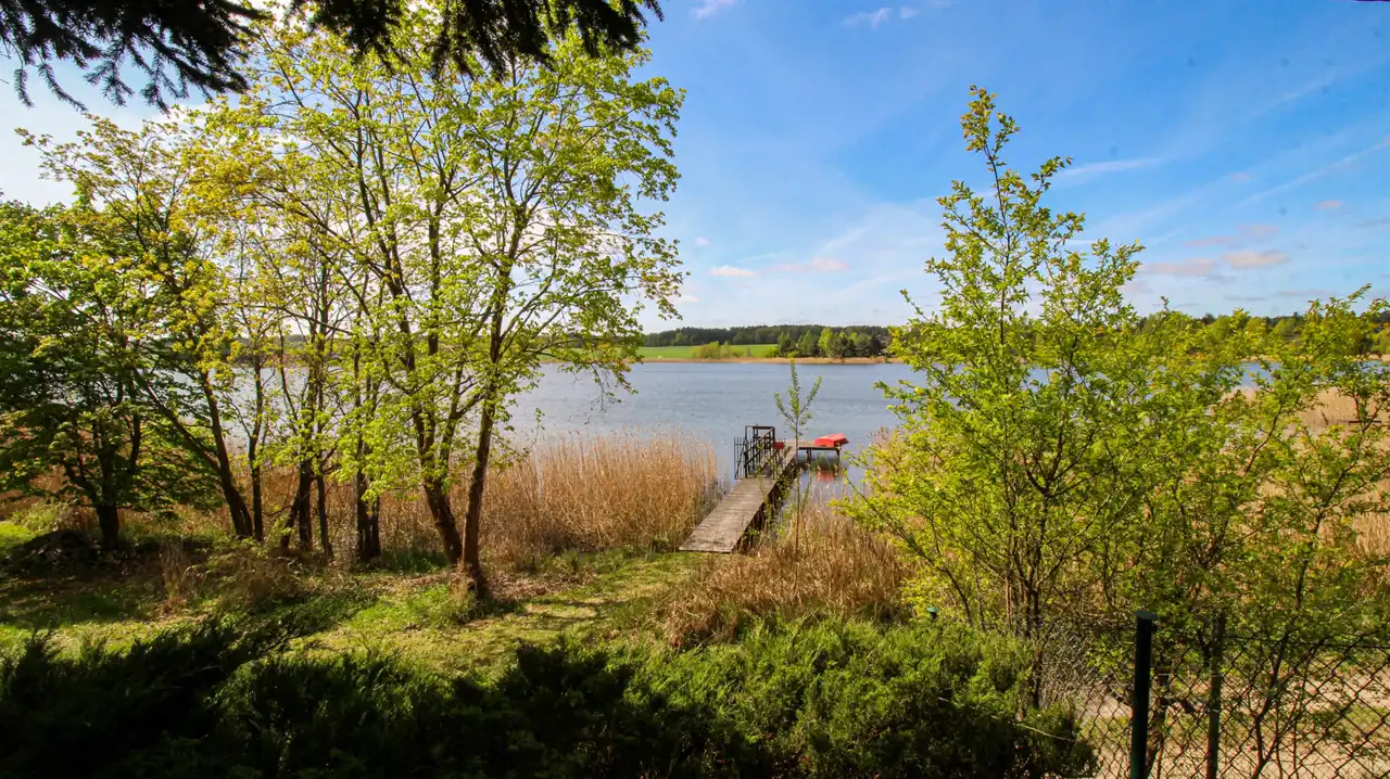 Nieruchomość jest otoczona lasem, a bezpośrednia bliskość jeziora czyni to miejsce prawdziwą oazą spokoju i prywatności.