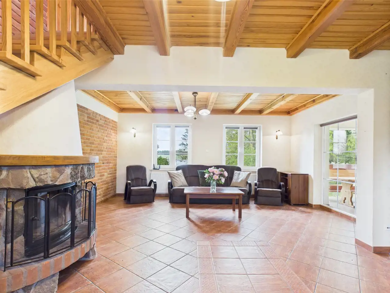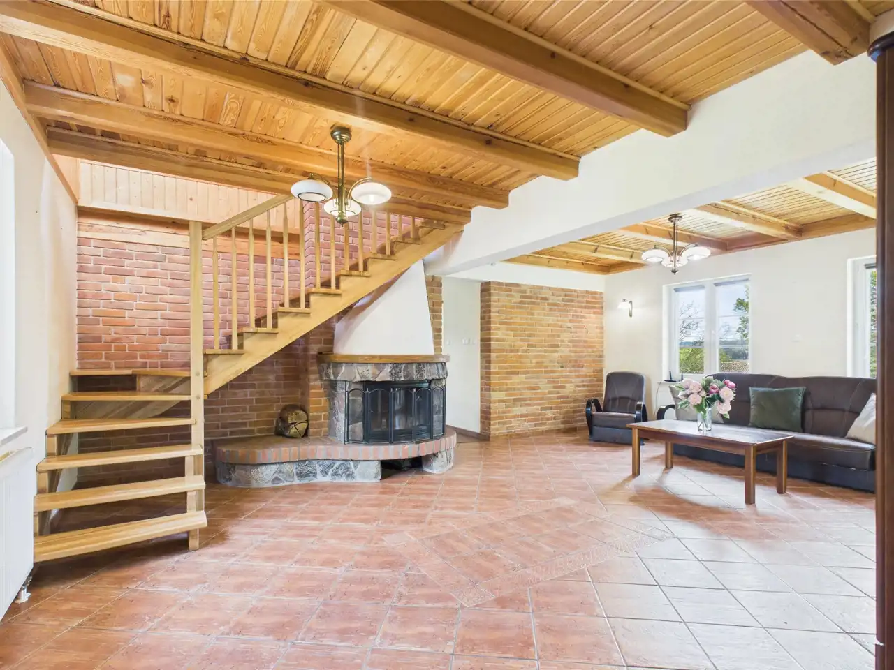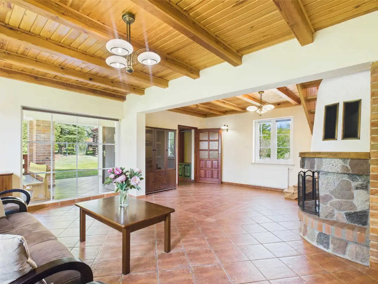 - Parter : przestronny salon z kominkiem wyjściem na taras, w pełni wyposażona kuchnia z jadalnią, łazienka z wanną oraz osobna toaleta.