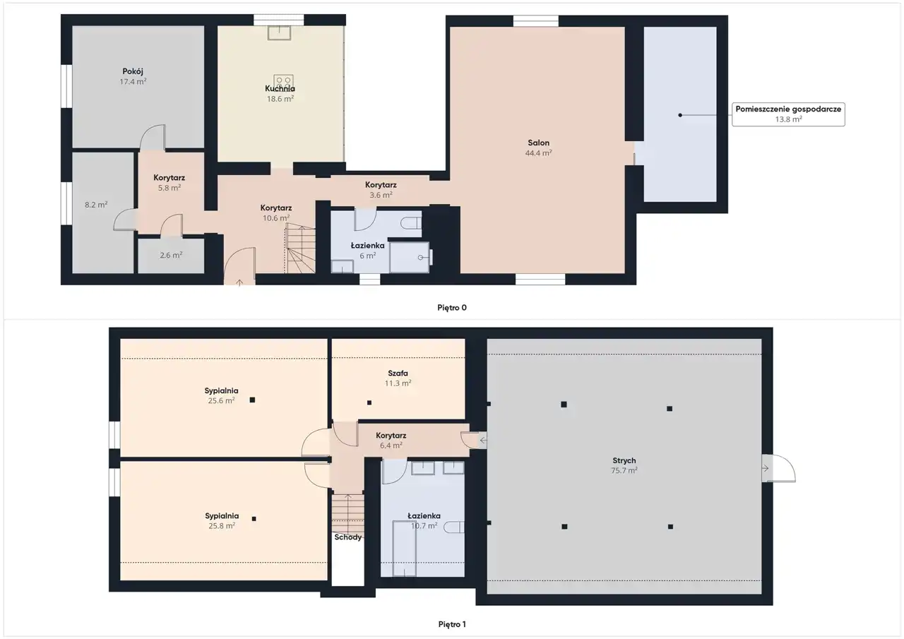 2 przestronne sypialnie – 19 m² i 18,9 m² (po podłodze: 26 m² i 25,2 m²)