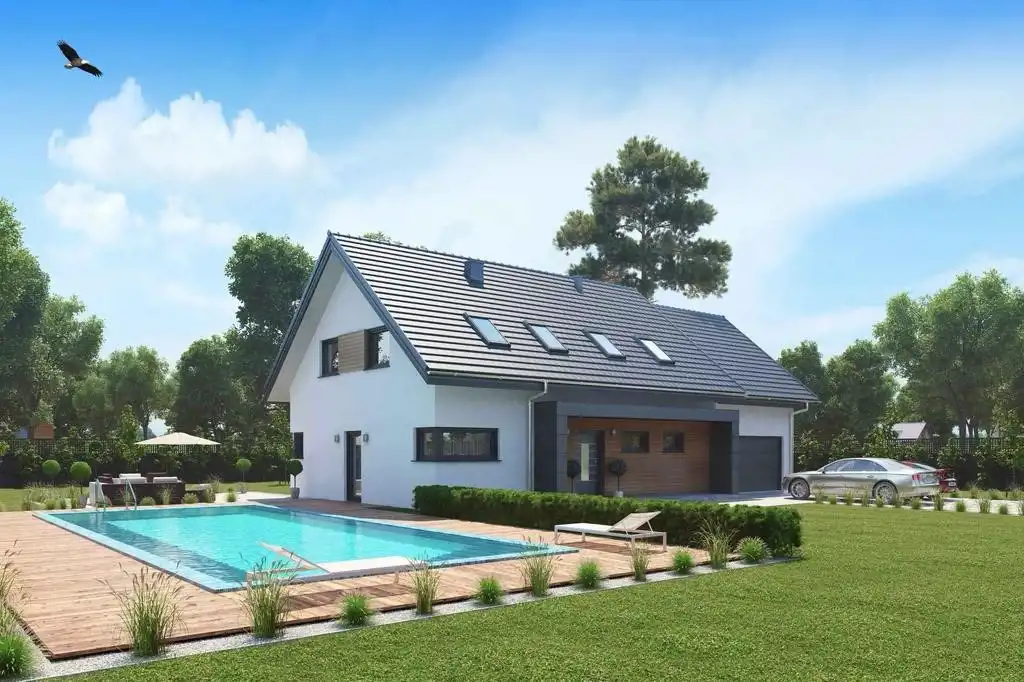 Dach dwuspadowy kryty wysokiej jakości płaską dachówką ceramiczną, ocieplony pod kalenice wełną o grubości 30cm. Okna PCV, trzyszybowe, z zewnątrz kolor antracyt, wewnętrzna strona okien koloru białego.