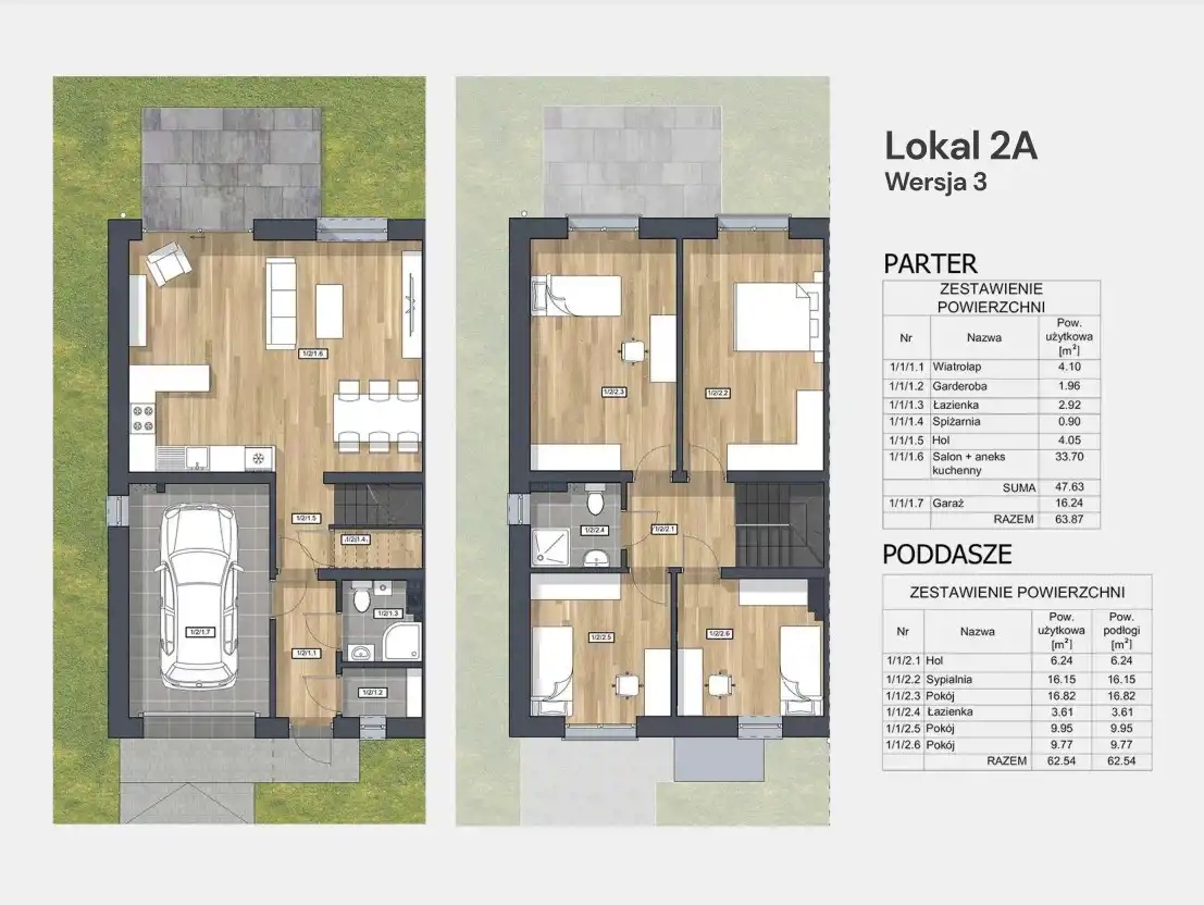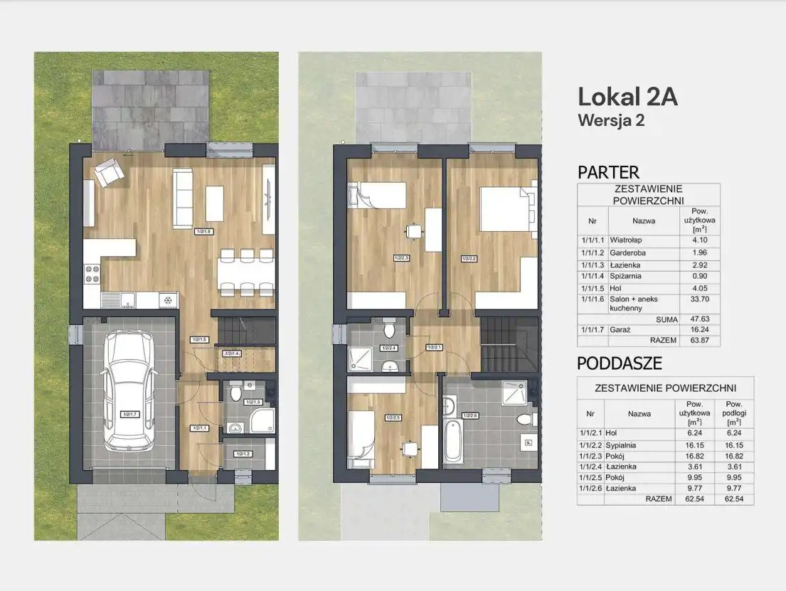 Przestronne budynki o nowoczesnej architekturze, z w pełni użytkowym piętrem bez skosów, zaprojektowane z myślą o funkcjonalności mieszkańców.