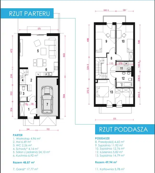 Przestronne budynki o nowoczesnej architekturze, z w pełni użytkowym piętrem bez skosów, zaprojektowane z myślą o funkcjonalności mieszkańców.